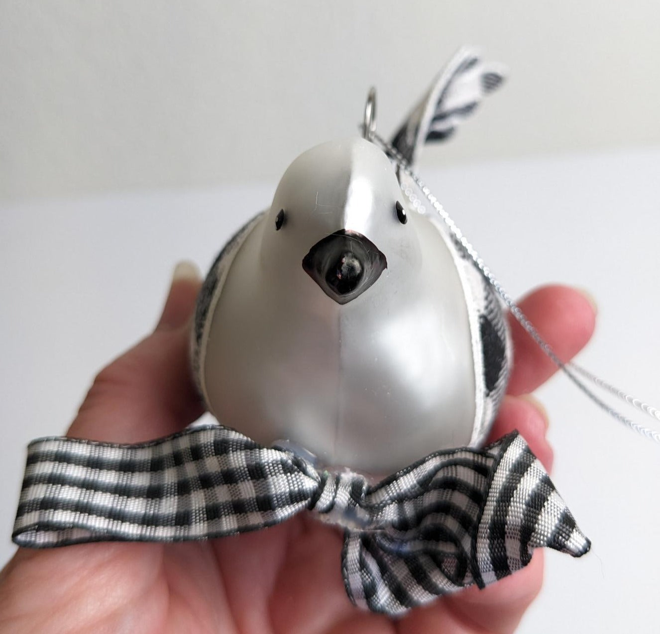 BRAND NEW ORNAMENT! Dress up your Christmas tree this gorgeous silver bird glass ornament. This ornament features a matte silver finish with black and white plaid accents, very pretty.