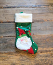 This is absolutely gorgeous. Featuring a jolly Santa on a green background with a wrapped gift and white polka dots, very festive! Perfect for anyone this holiday season. It is in great condition. Would look fantastic on your Christmas mantel waiting to be filled by Santa. Beautifully made.