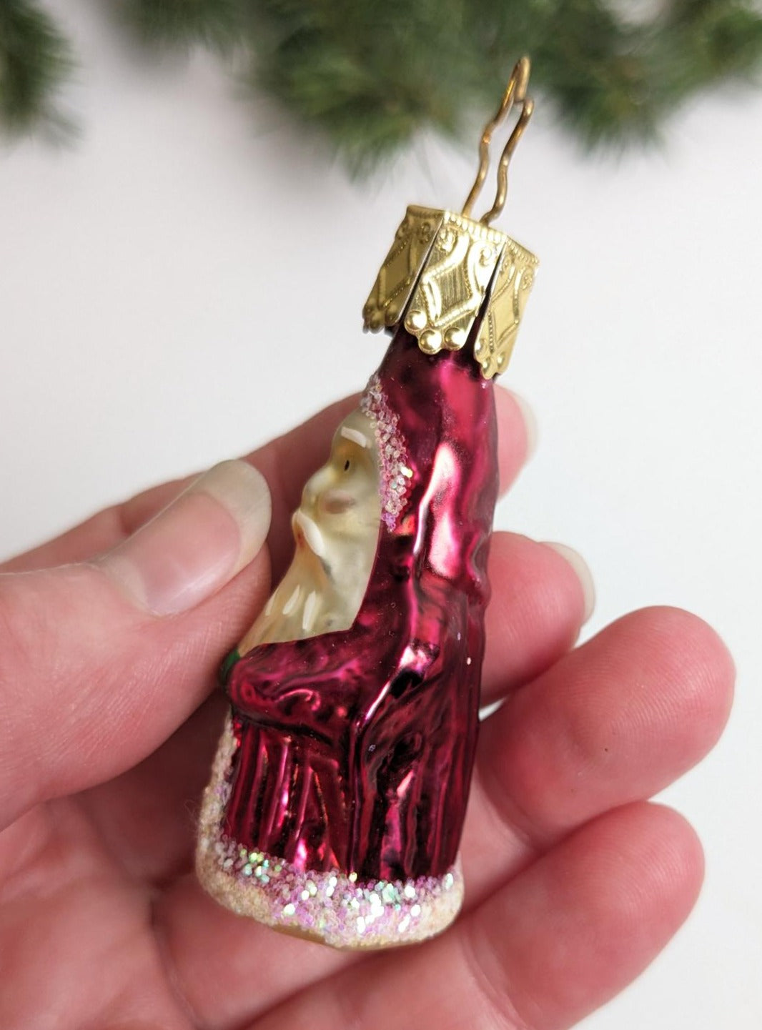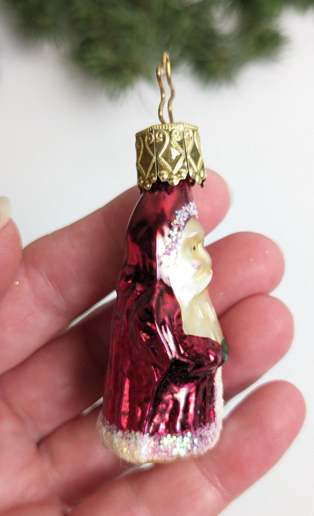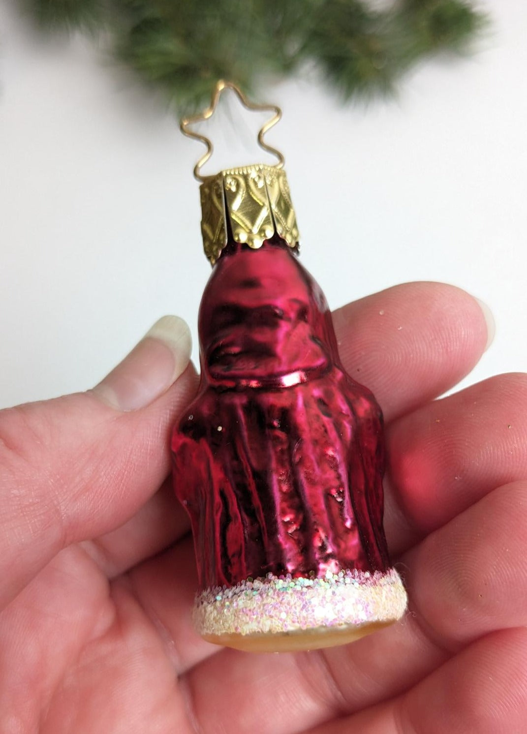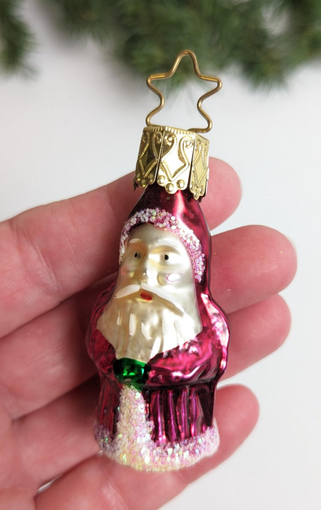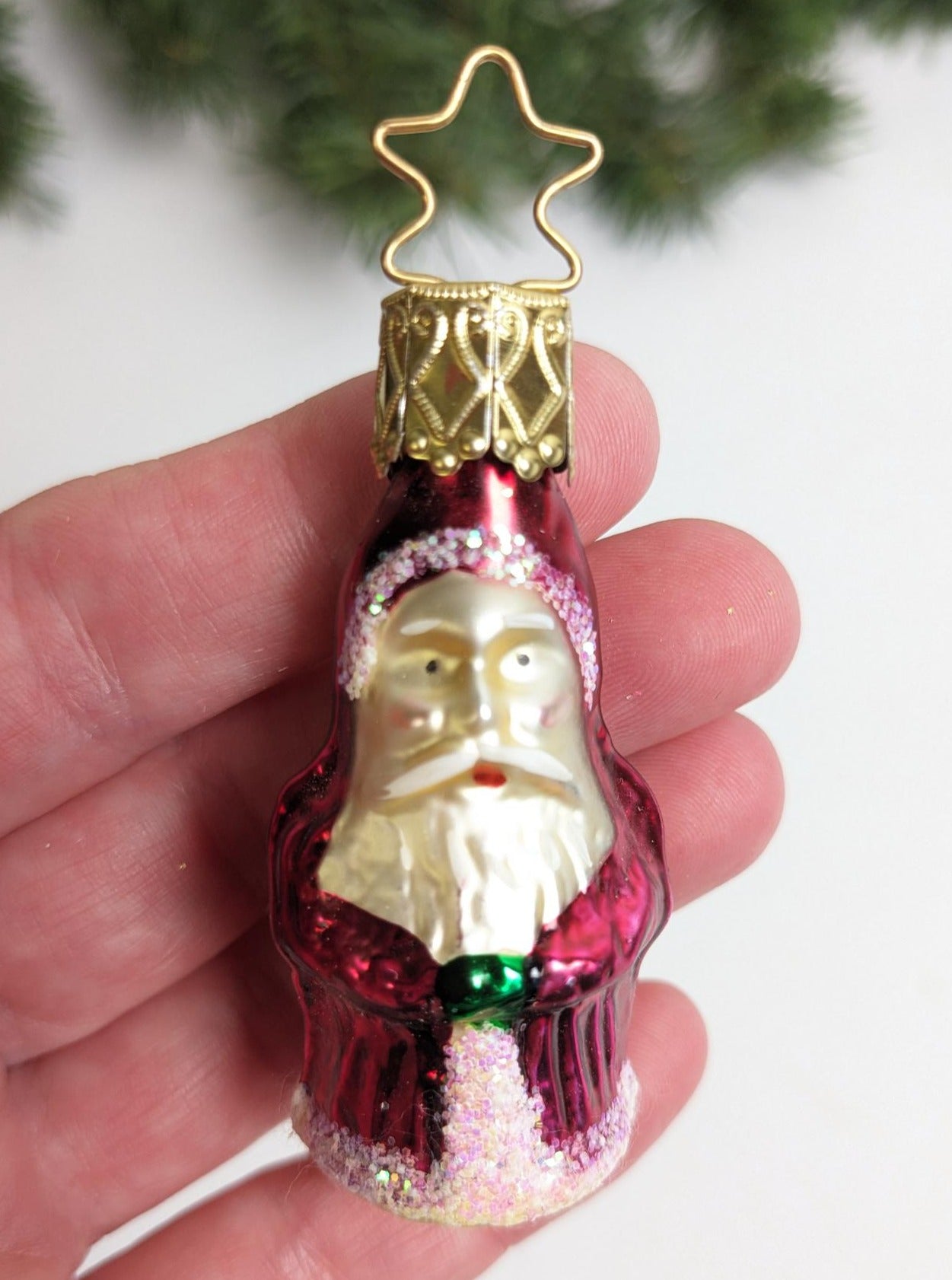 New Gorgeous Small Vintage Santa Claus Glass Christmas Ornament made by Inge-Glas in Germany. What a rare find and absolutely beautiful with wonderful detail, color and a delicate sparkle. Great addition to your vintage Christmas ornament collection. This is a RETIRED old World Christmas ornament, and they are very hard to find anymore. Measuring 2.25" tall.
