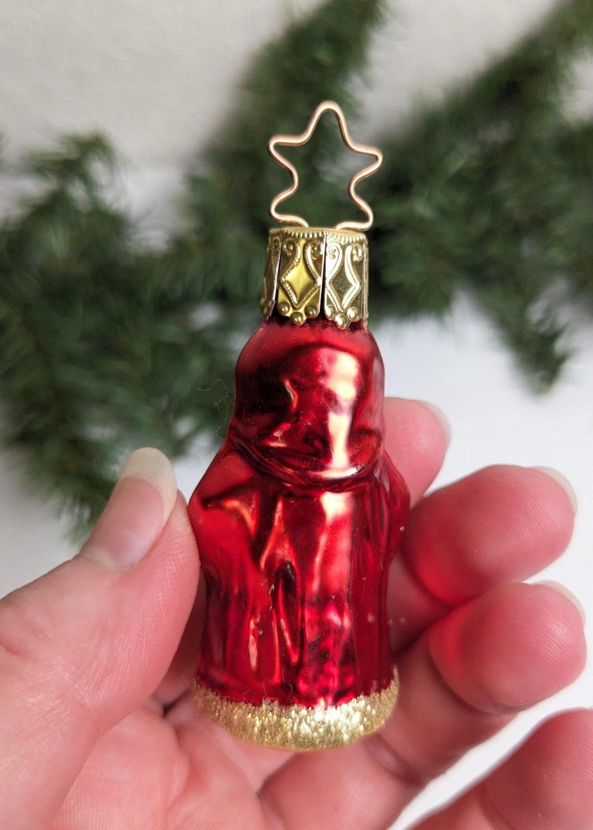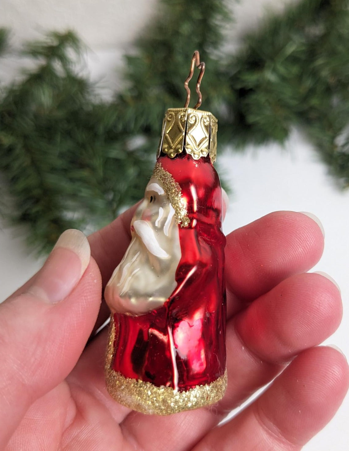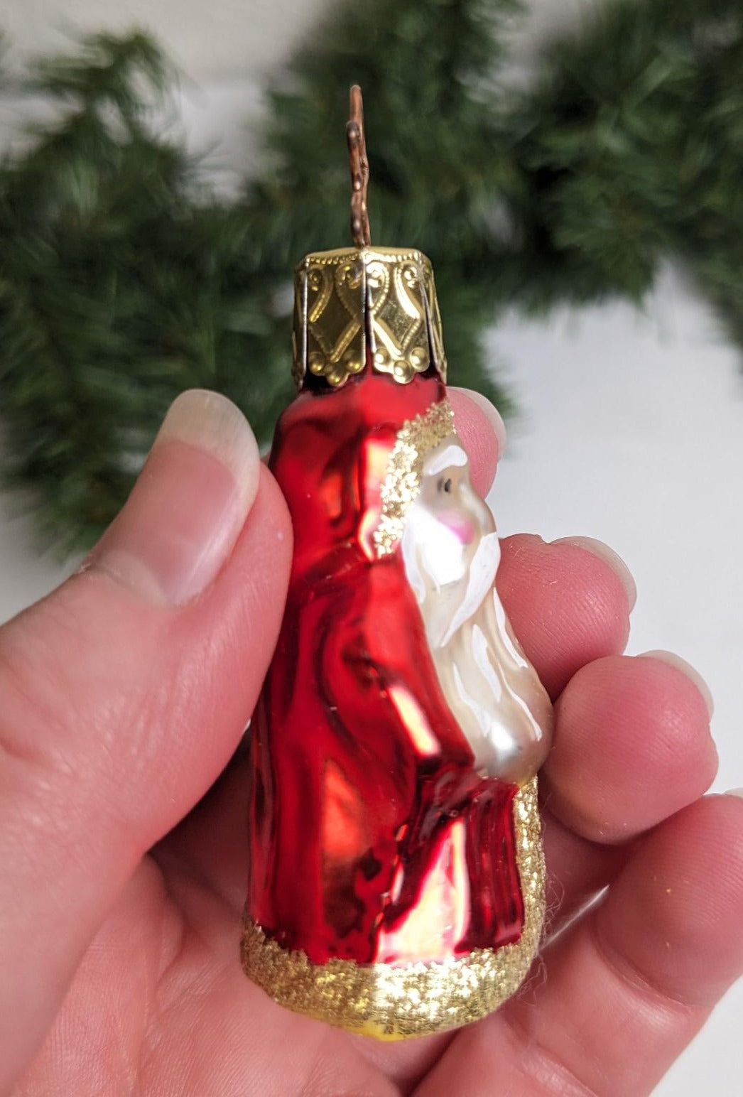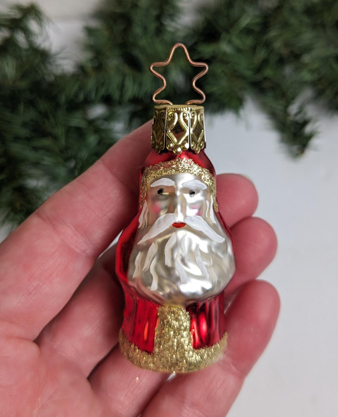 New Gorgeous Small Vintage Small Santa Claus Glass Christmas Ornament made by Inge-Glas in Germany. What a rare find and absolutely beautiful with wonderful detail, color and a delicate sparkle. Great addition to your vintage Christmas ornament collection. This is a RETIRED old World Christmas ornament, and they are very hard to find anymore. Measuring 2.35" tall.