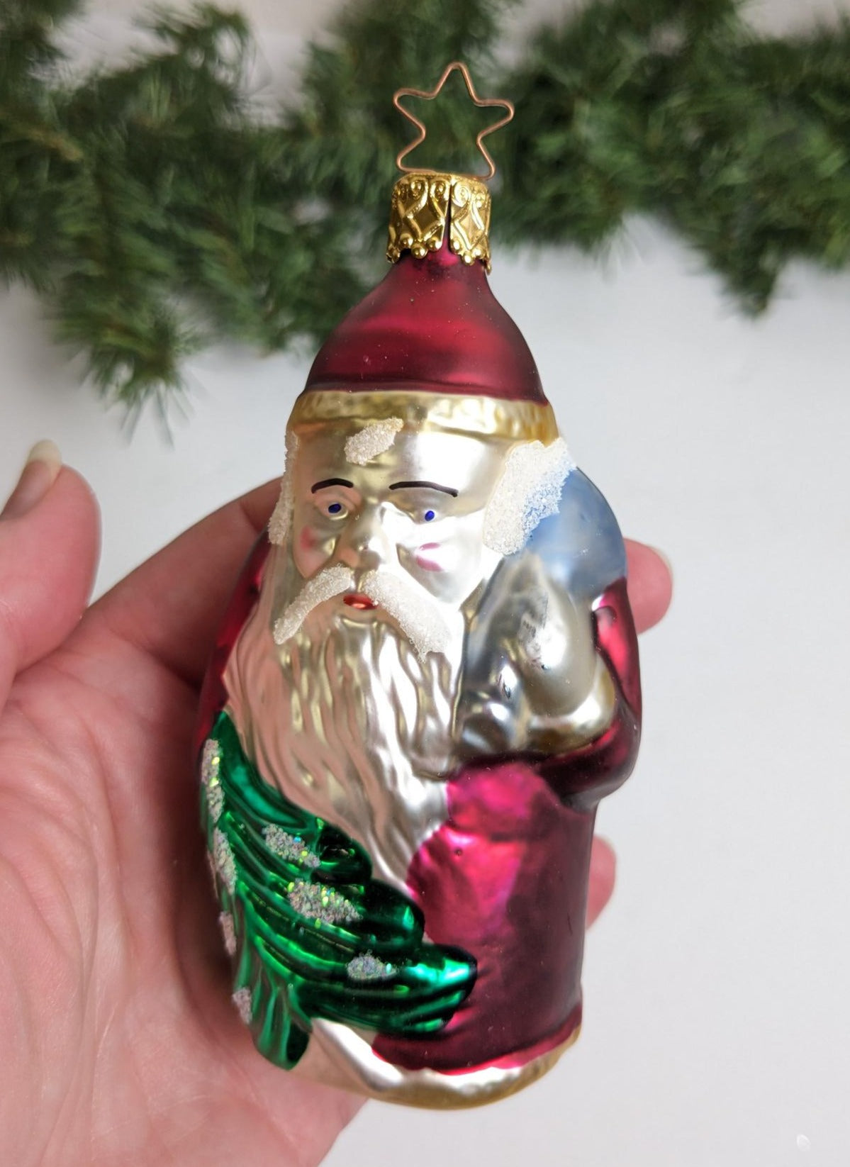 Gorgeous Vintage Santa Claus Glass Christmas Ornament made by Inge-Glas in Germany. What a rare find and absolutely beautiful with wonderful detail, color and a delicate sparkle. Great addition to your vintage Christmas ornament collection. This is a RETIRED old World Christmas ornament, and they are very hard to find anymore. Measuring 4.25" tall.