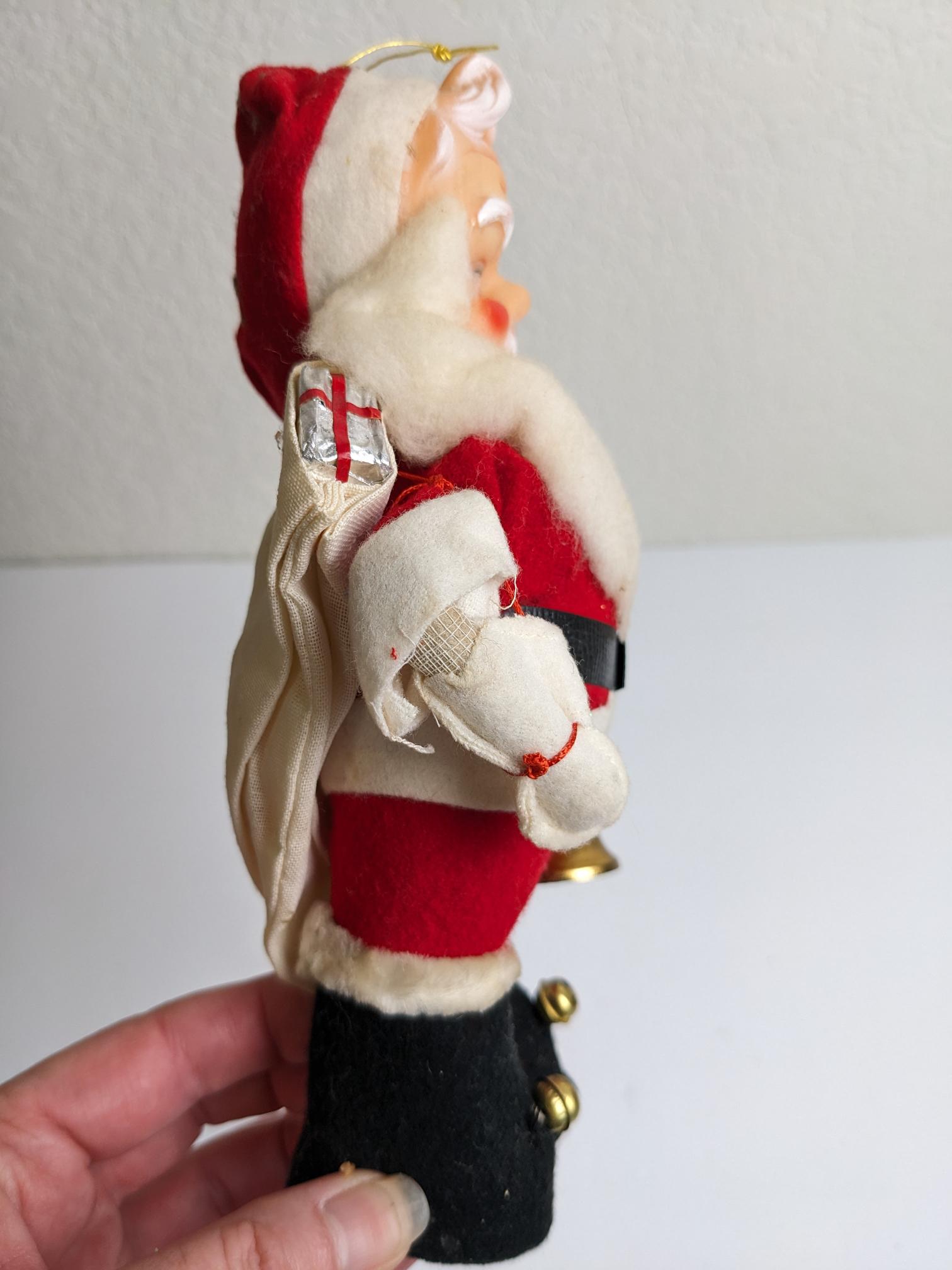 Beautiful Large Vintage Santa Claus Christmas Ornament, made in Japan. This is a fantastic find. This jolly fella is wearing his iconic red suit with posable arms, bells on his shoes and a rubber face, so cute!