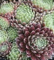 Sempervivum 'Allison' (Smits): A particularly tidy rosette that matures into an exceptionally fuzzy cluster. This cultivar shows mesmerizing spirals of tightly packed leaves. The foliage can shift between spring green and rusty red. A fuzzy covering of white hairs makes this cutie stand out in a garden.