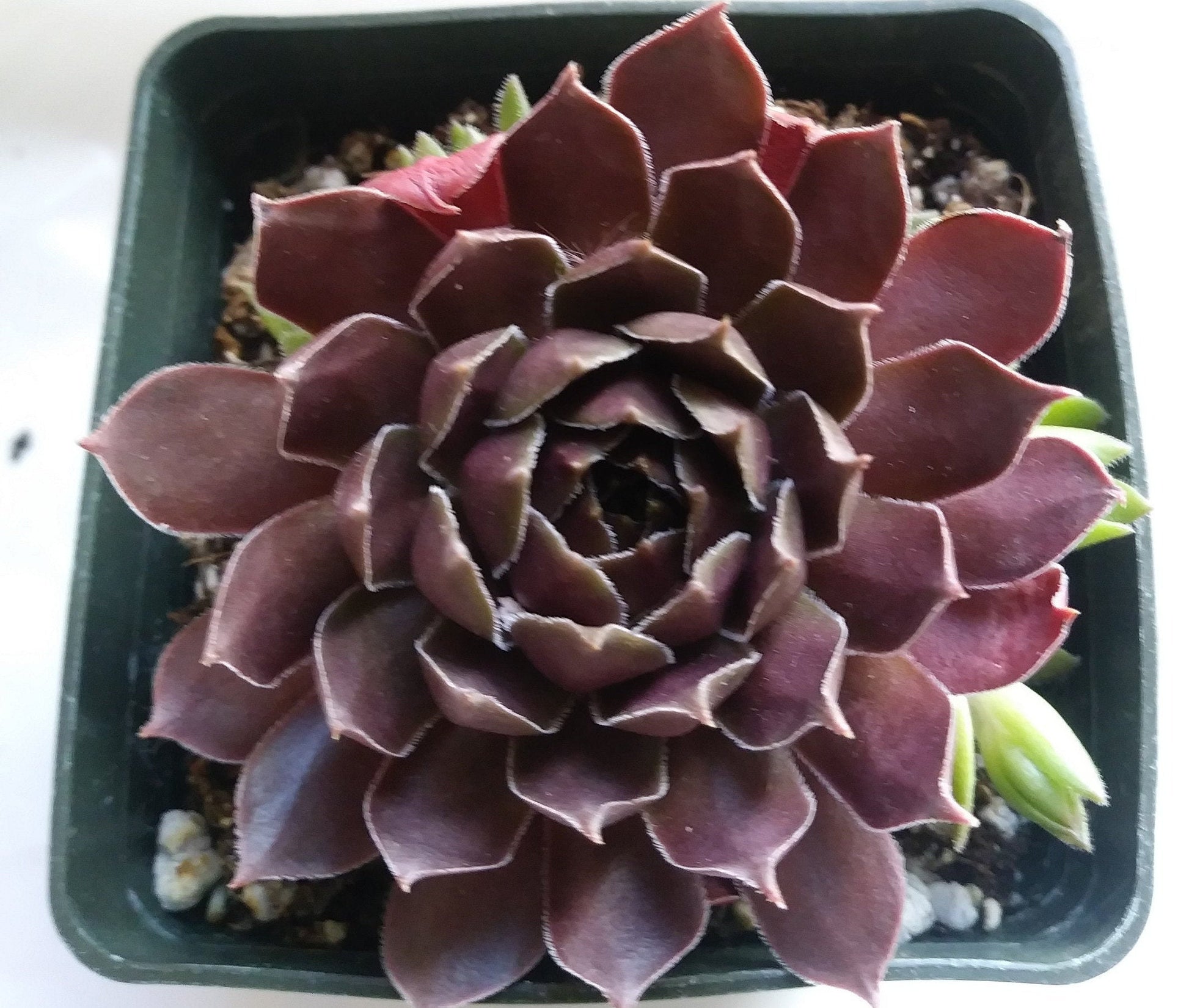 Sempervivum Pacific Shadows Hardy Perennial. This beauty will delight your senses with its deep burgundy red rosettes. Holds its color year round. Excellent grower in full sun and well drained soil. Perfect for rocky areas as well as well drained containers. Zone 3-8. Ships semi-bare root.