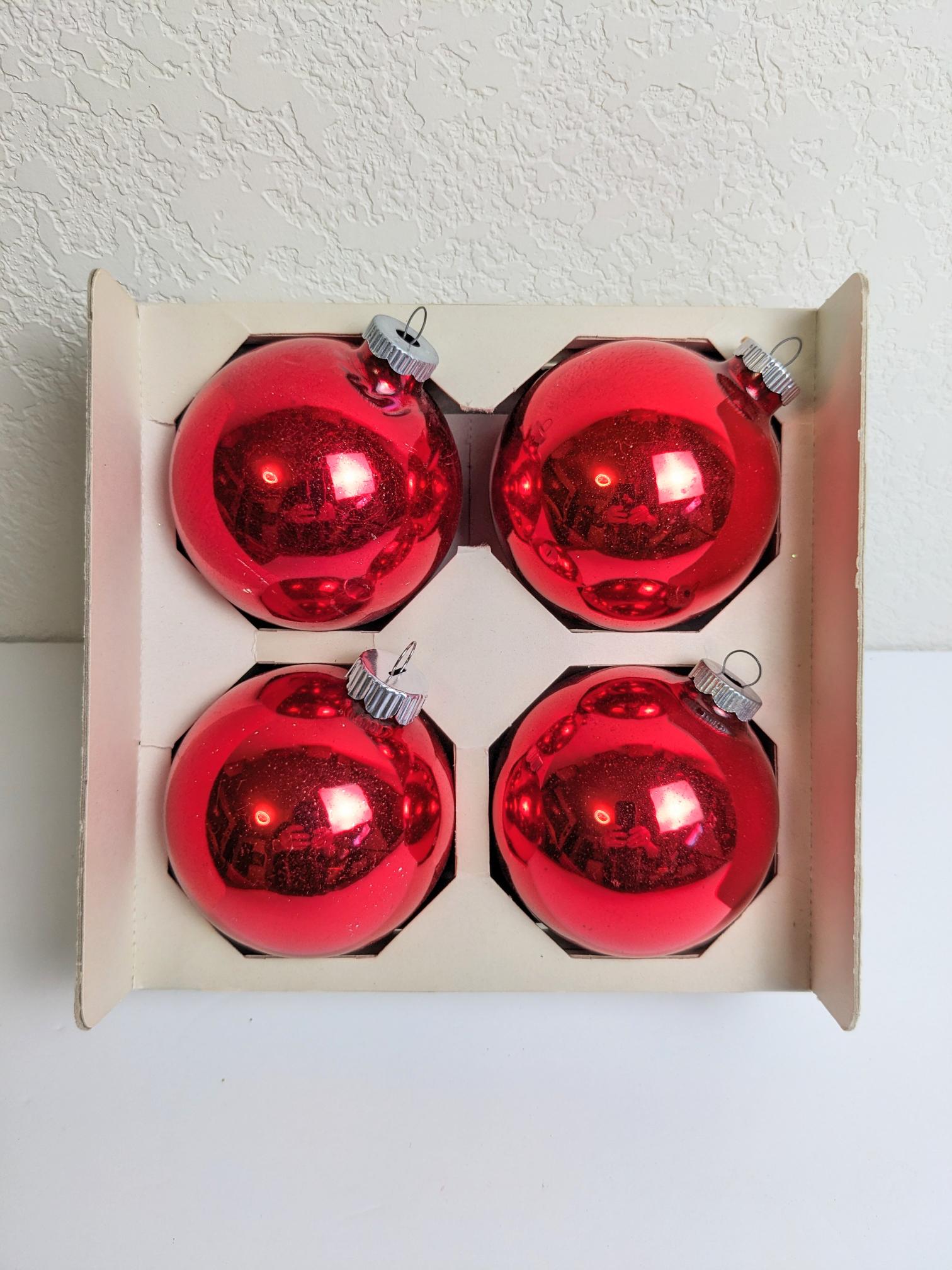 Vintage set of 4 Large Red Glass Christmas Ornaments.Wow, what a rare find! Gorgeous red Shiny Brite ornaments with their iconic silver crowns in wonderful vintage condition with light crazing, spotting and scratches. Please see pictures.