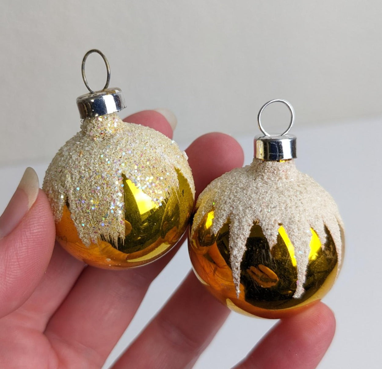 The reflector ornament has glue residue on the back side, please see the last picture. This is a rare find. These stunning ornaments would look fantastic on any tree or wreath. Wonderful addition to your vintage ornament collection. Hurry, we have 1 set in stock. All measuring around 1.95" tall.
