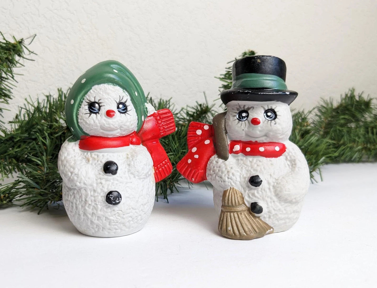 Vintage Snowman and Snowwoman Salt and Pepper Christmas Shakers. How cute are these? Perfect for your holiday table or would look fantastic on your mantel. They are in great vintage condition with rub marks here and there, please see all pictures. Hurry we have 1 set in stock!