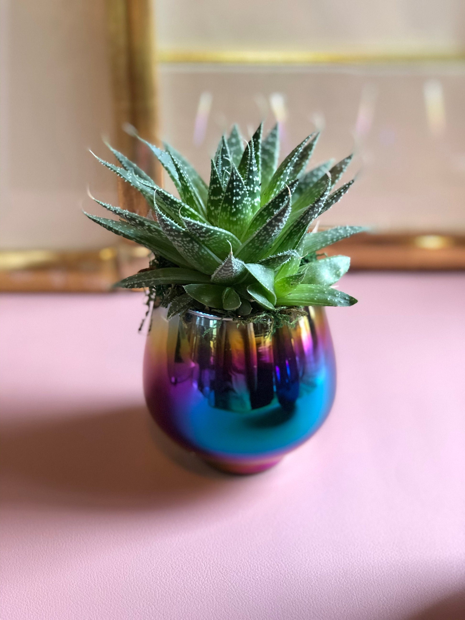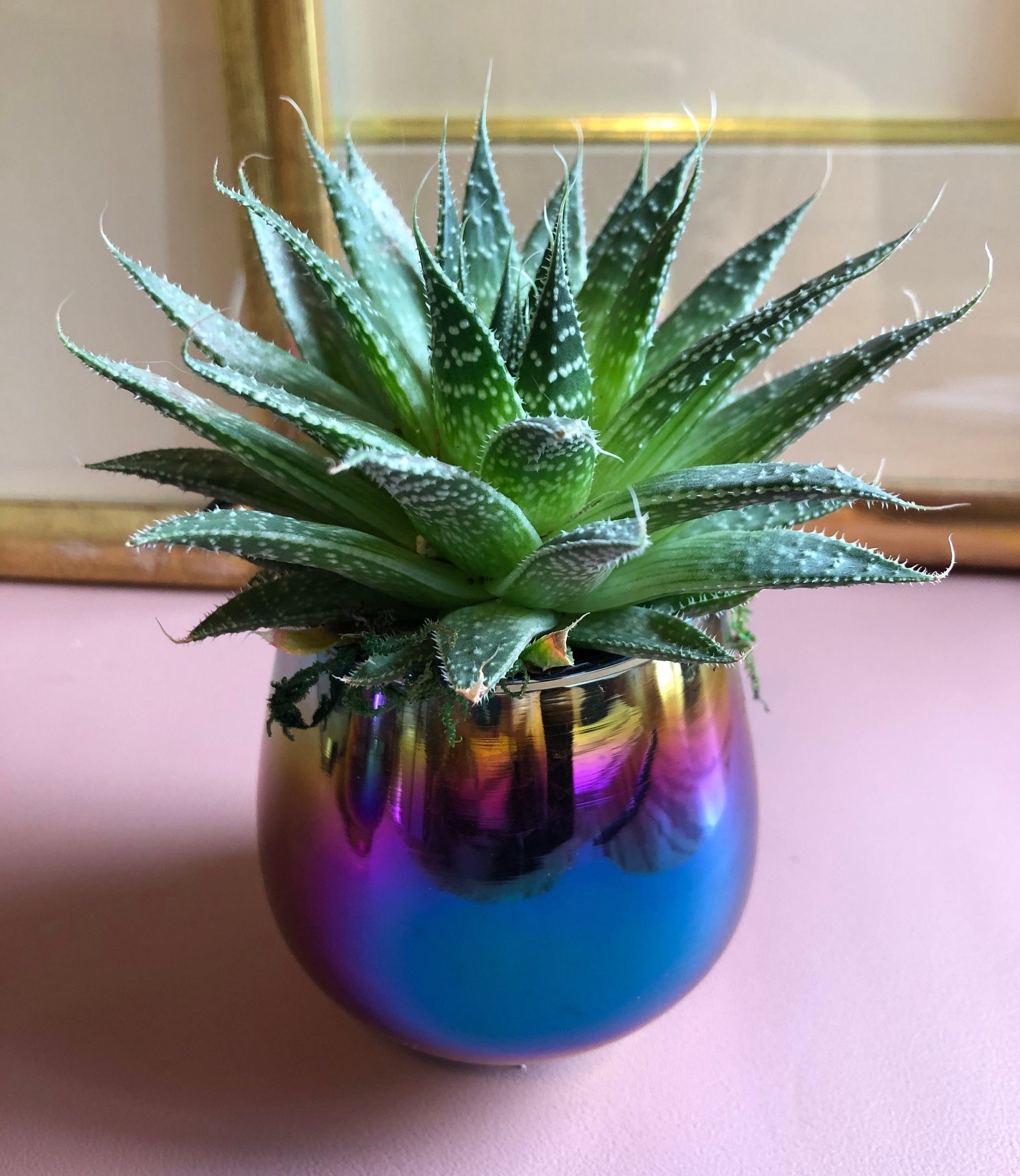 Succulent plant growing in a glass iridescence rainbow planter. Great for wedding shower, congratulations, new home, thank you, teacher, birthday, anniversary, office special favor, sympathy, love gift.