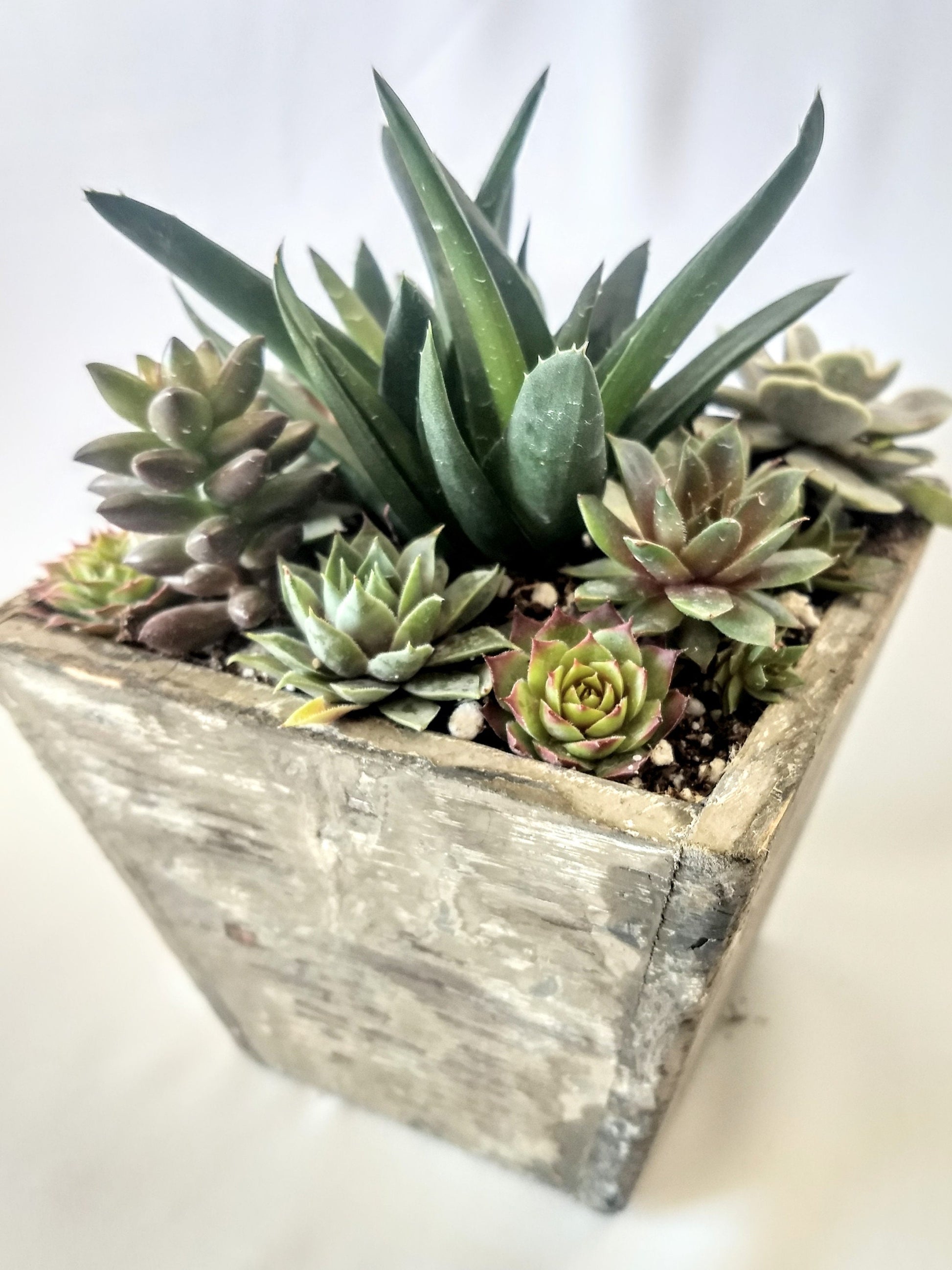 This cute succulent planter would make a great gift for plant lovers! It comes with an angled wooden square planter that measures about 4.5 inches at the top and 3 inches at the bottom, soil, and an array of live succulent plants that will make it stand around 7 inches tall.