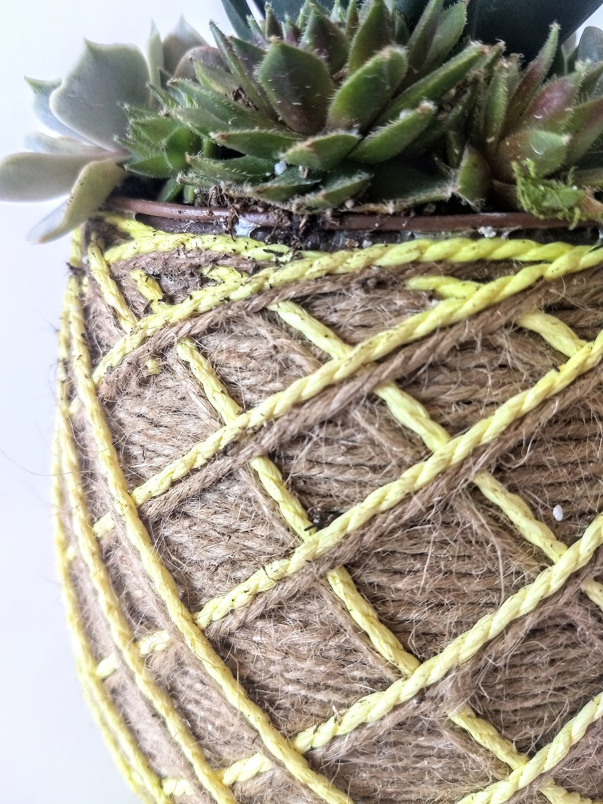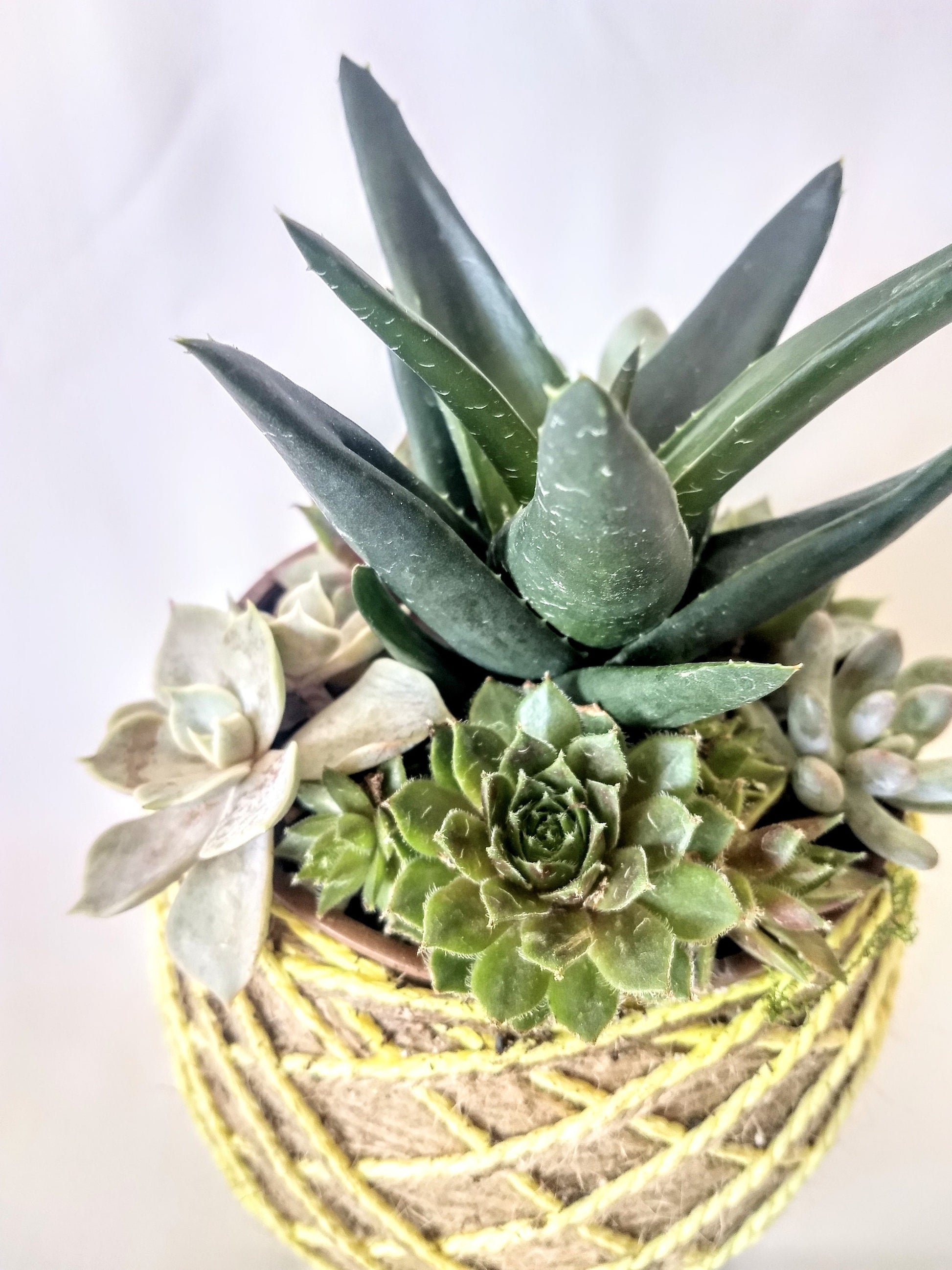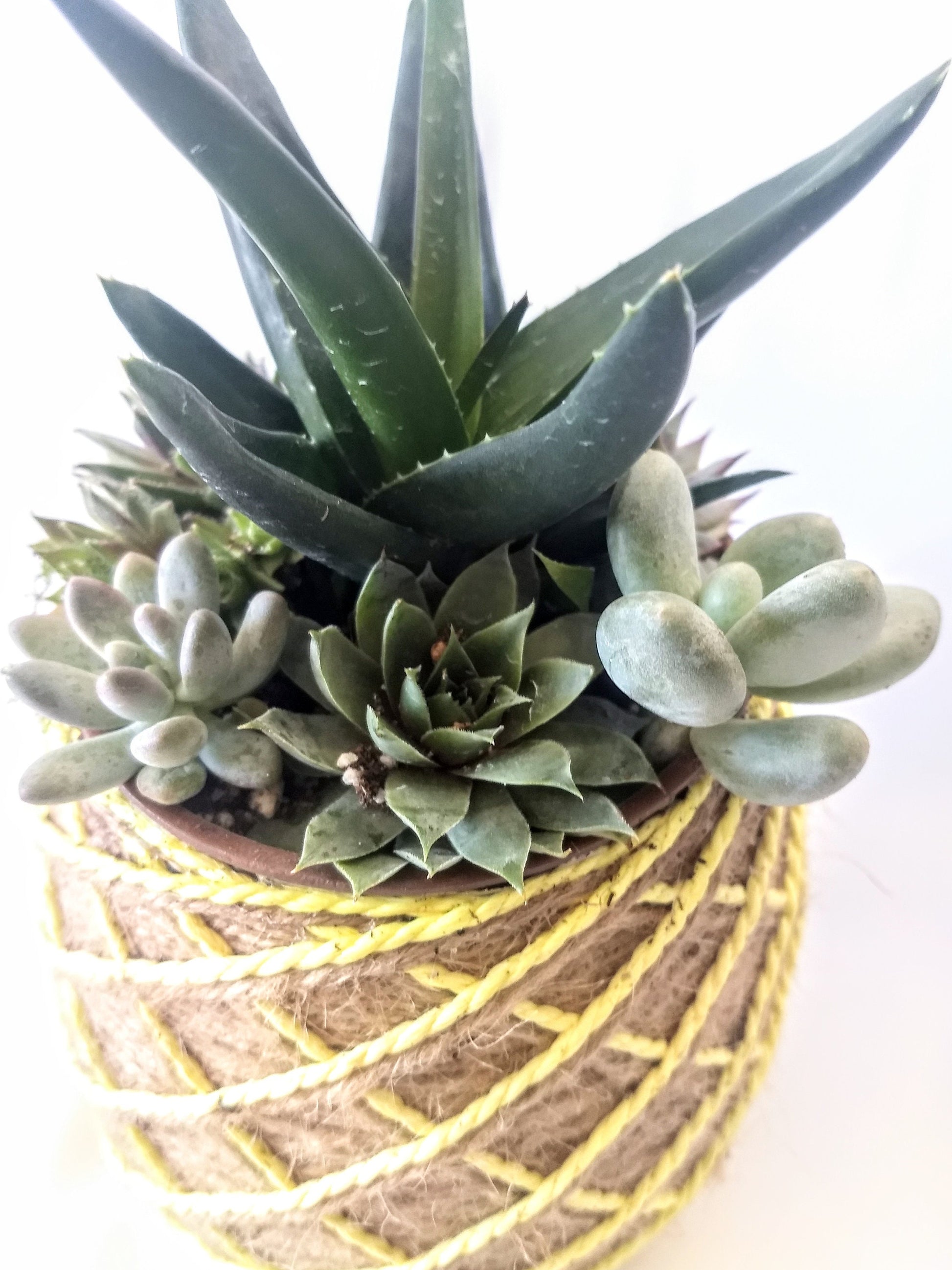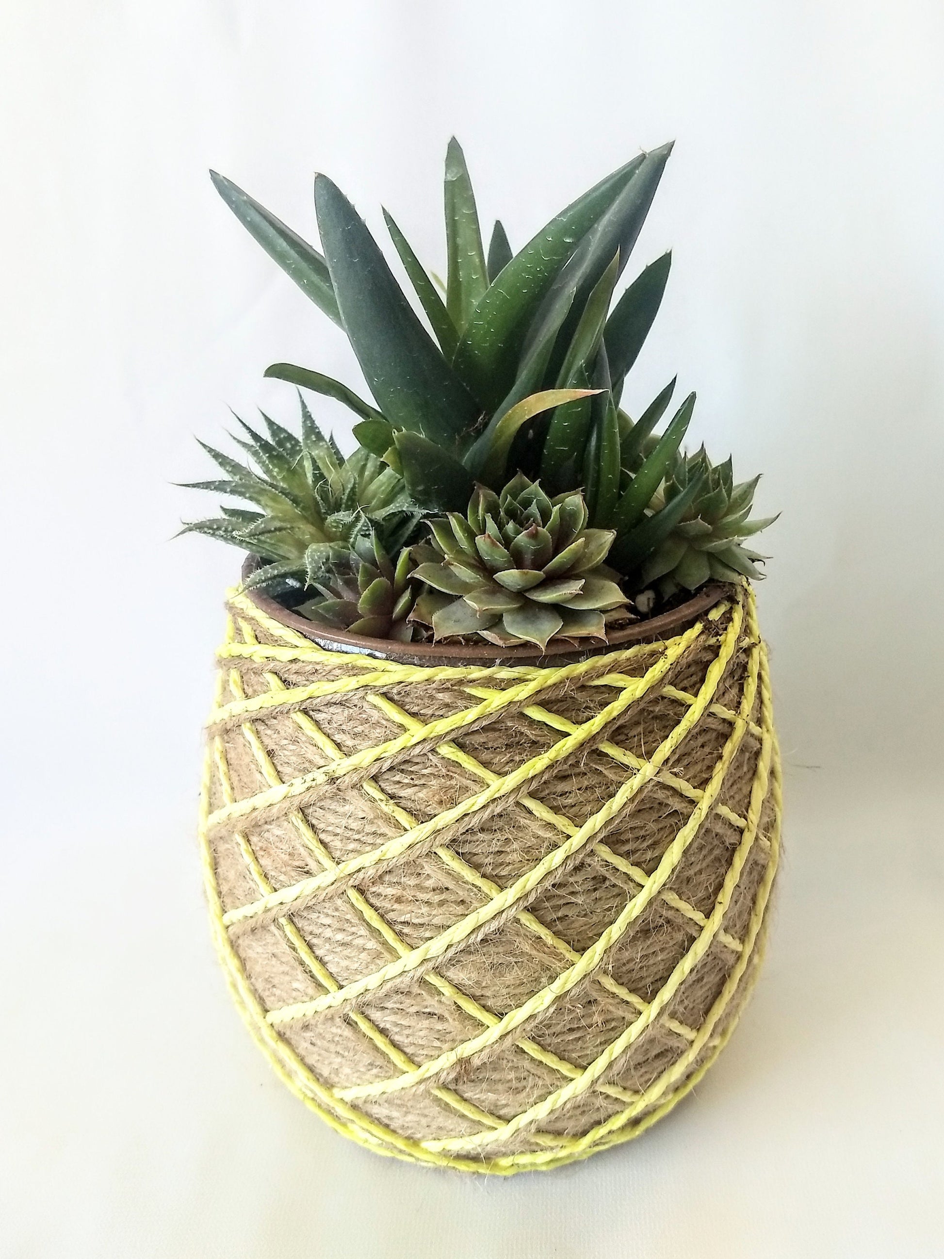Succulent planter with variety of live mixed succulent plants in a twine basket pineapple style planter. Including plants, this piece stands about 8 inches tall. This planter has yellow crisscrossing lines of twine which make it look like a cute pineapple. This would make a great gift for someone searching for the perfect shelf decor item, or for anyone who loves plants. The plants we use in each one will vary, but will be a very nice selection that will be pleasing to the eye.