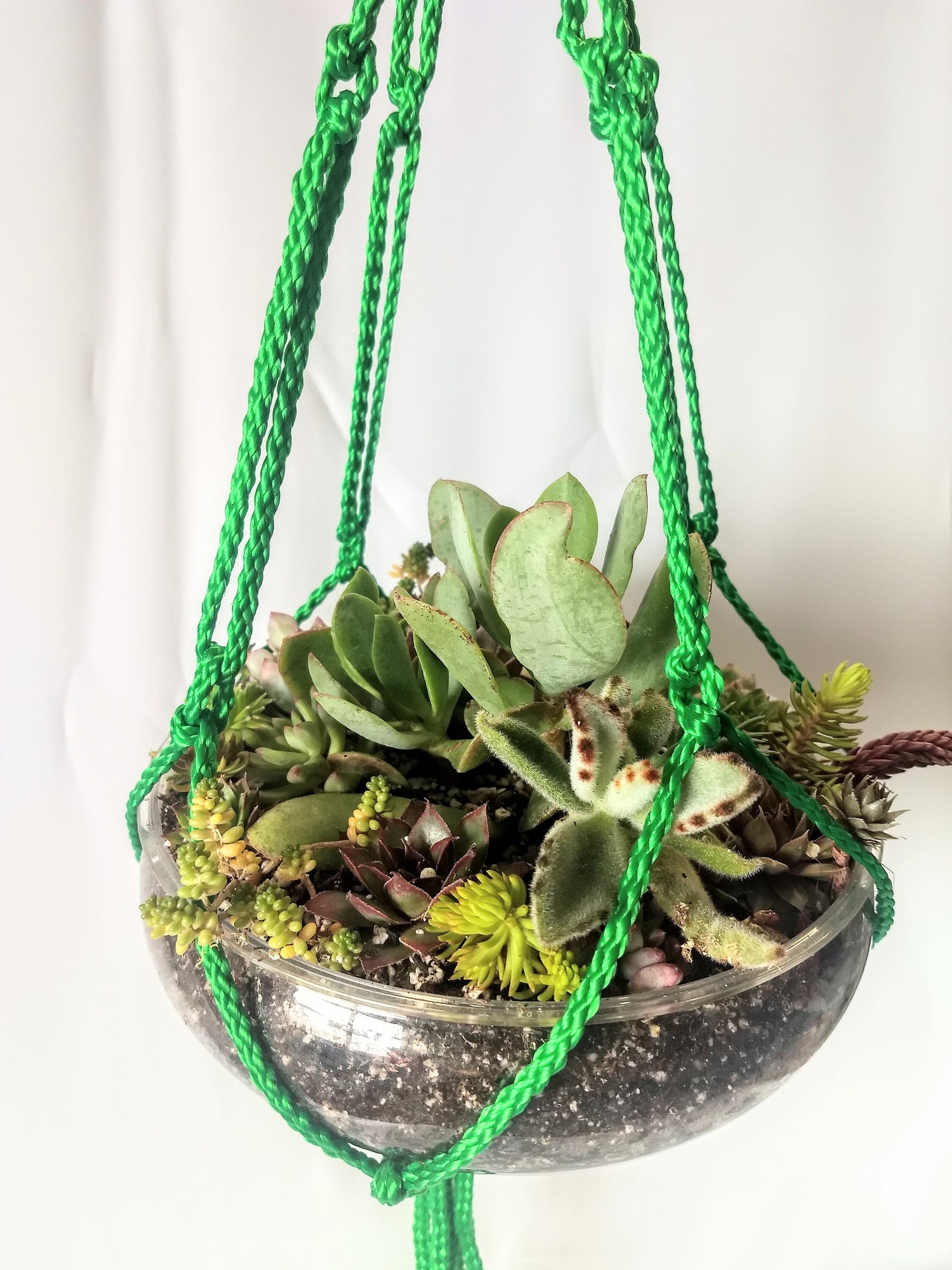 Hanging succulent terrarium, with plastic terrarium planter, soil, live succulent plants and macramé hanger. Cute as a staple bedroom decor piece or anywhere in the home. Your choice of either green or black hanger. Plants vary, but examples are shown in photos. This is a great gift idea! It hangs about 19 inches long, and the terrarium itself is 8 inches in diameter at the widest point.