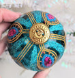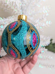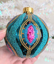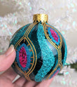New Gorgeous Turquoise and Pink Glass Christmas Ornament. What a rare find and absolutely beautiful with wonderful detail, color and sparkle. Makes a great hostess or heirloom gift. Perfect for the turquoise or peacock fan in your life. Wonderful addition to your Christmas ornament collection. Indoor Use Only. Measuring 3 1/2" tall. Hurry we only have 1 in stock.