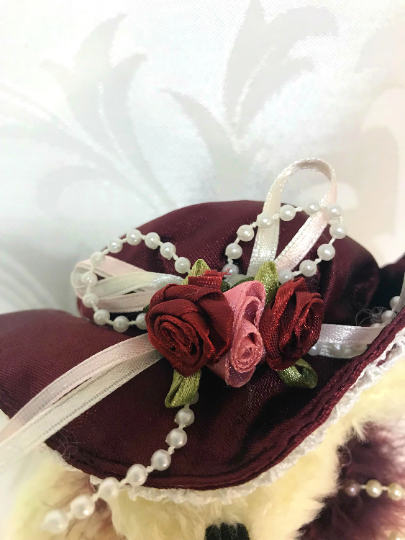 Victorian Hat With Pink  Burgundy Roses, Pearl Necklace, and Burgundy Boa
