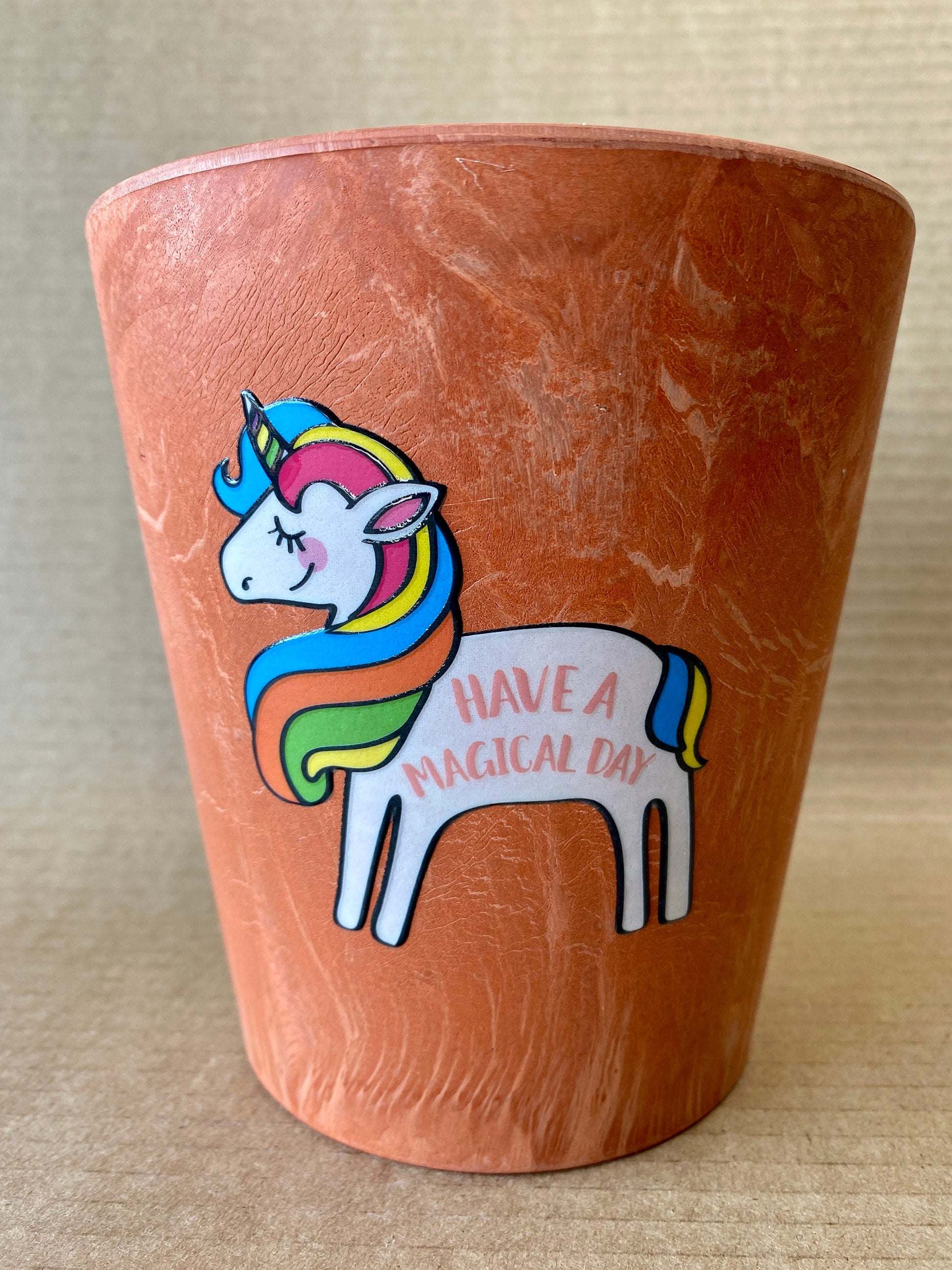 This adorable planter features a cute unicorn on the front of a heavy duty plastic pot. This pot does not have drainage holes as it is a cache pot, meaning you place an already potted plant inside the pot. This would make the perfect gift for a variety of people including, your favorite unicorn obsessed child or adult, or anyone who is looking for a cute way to add some whimsy to their decor! A hole can easily be drilled in the bottom of this pot if you wanted.