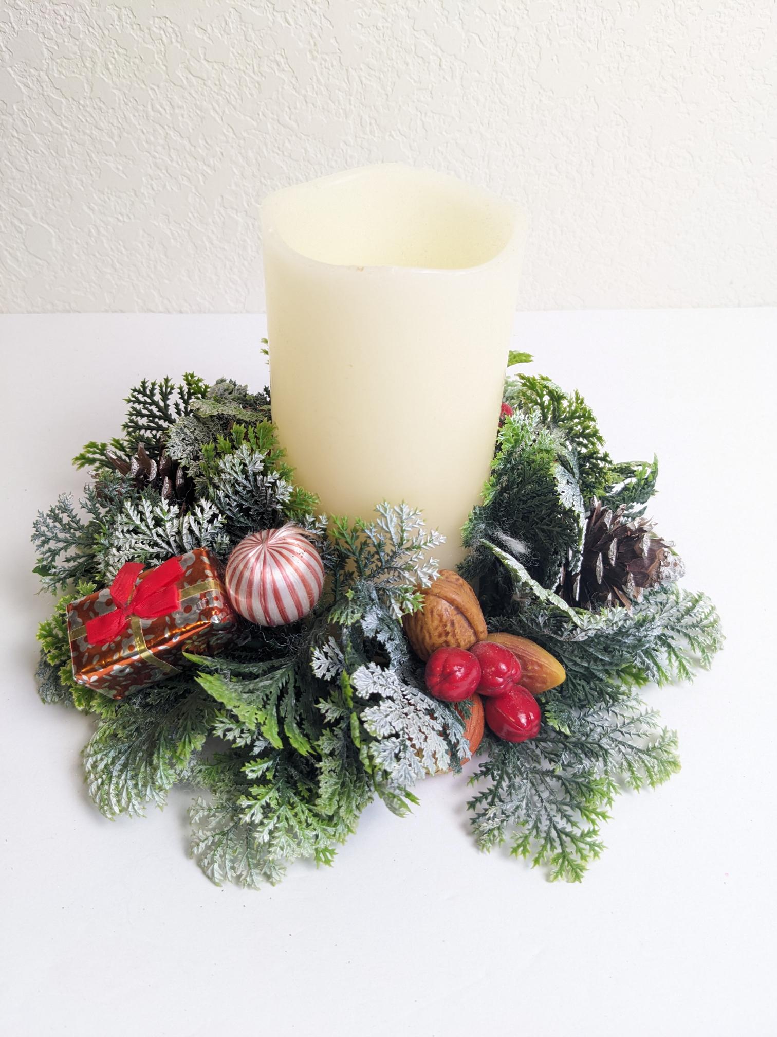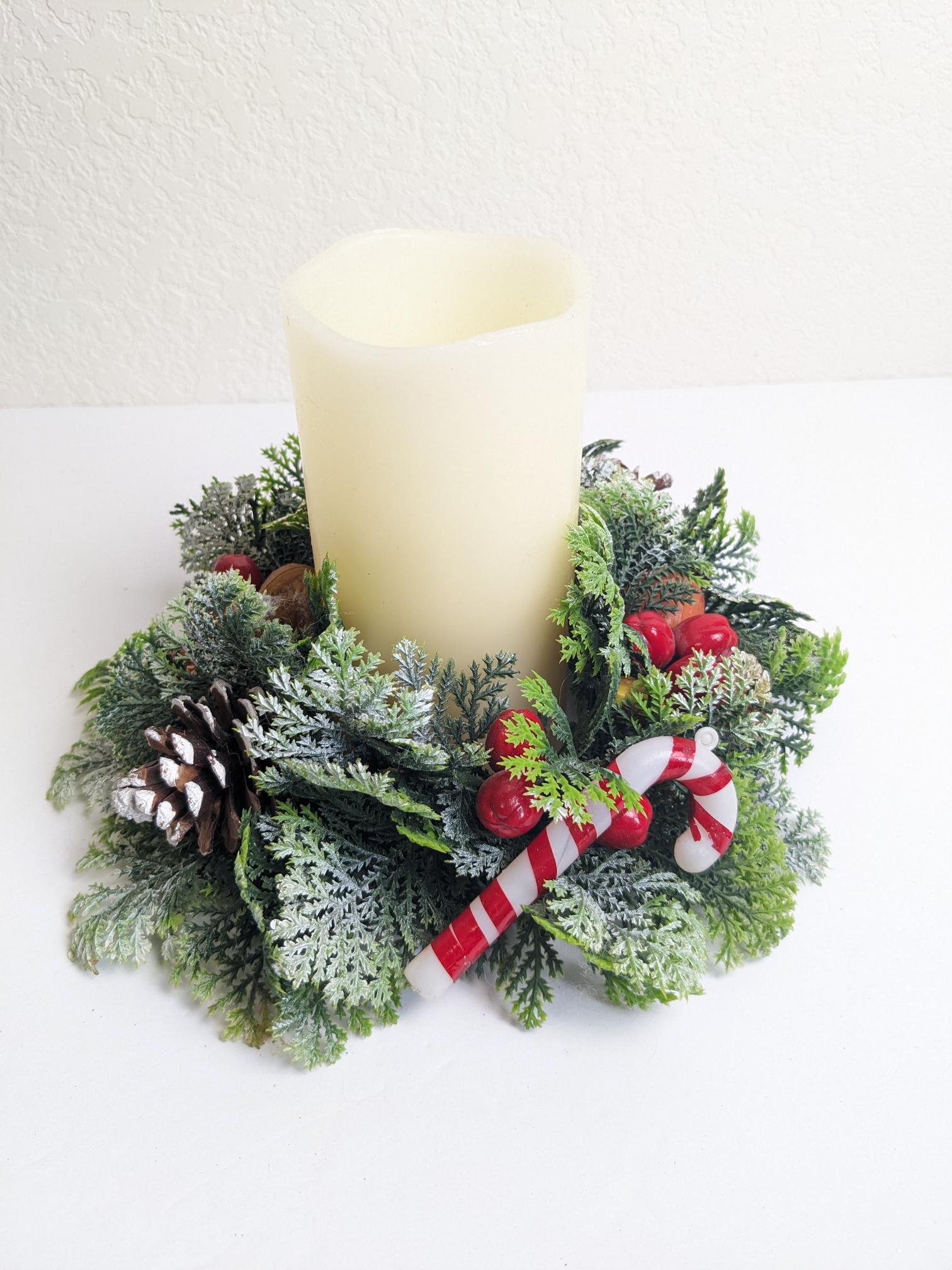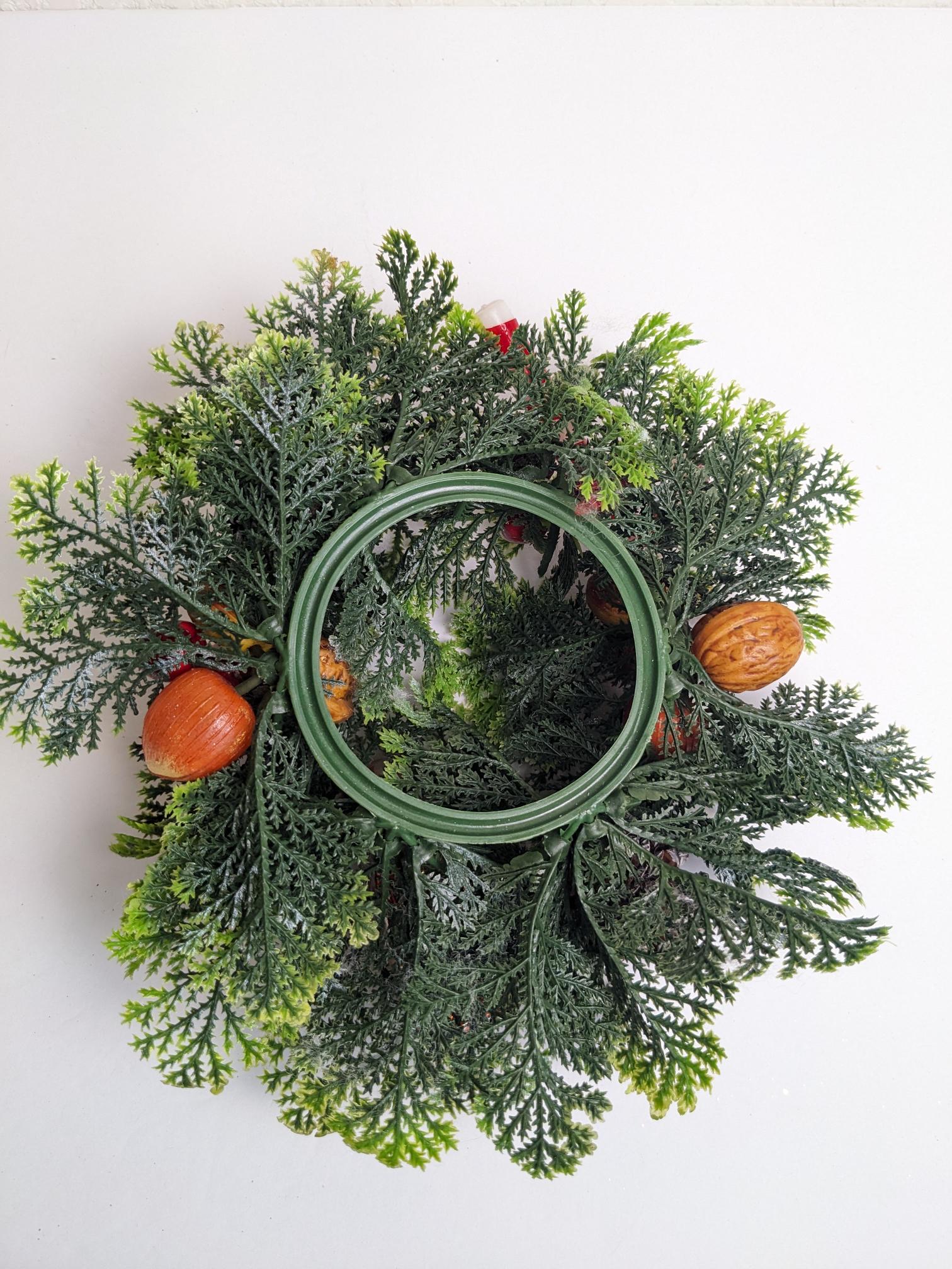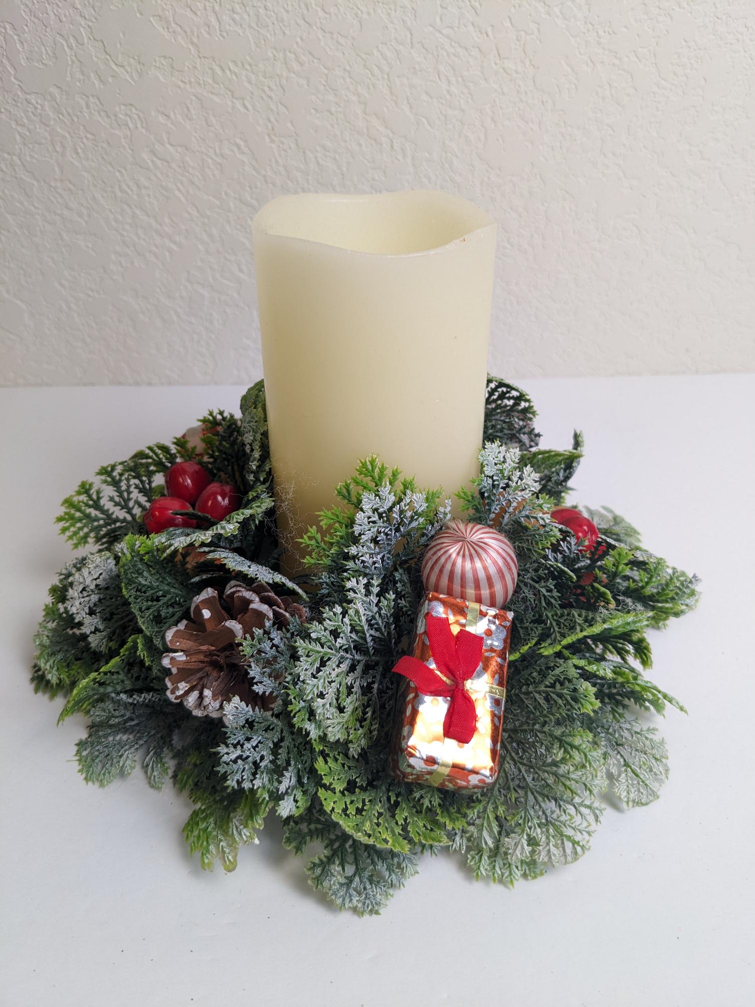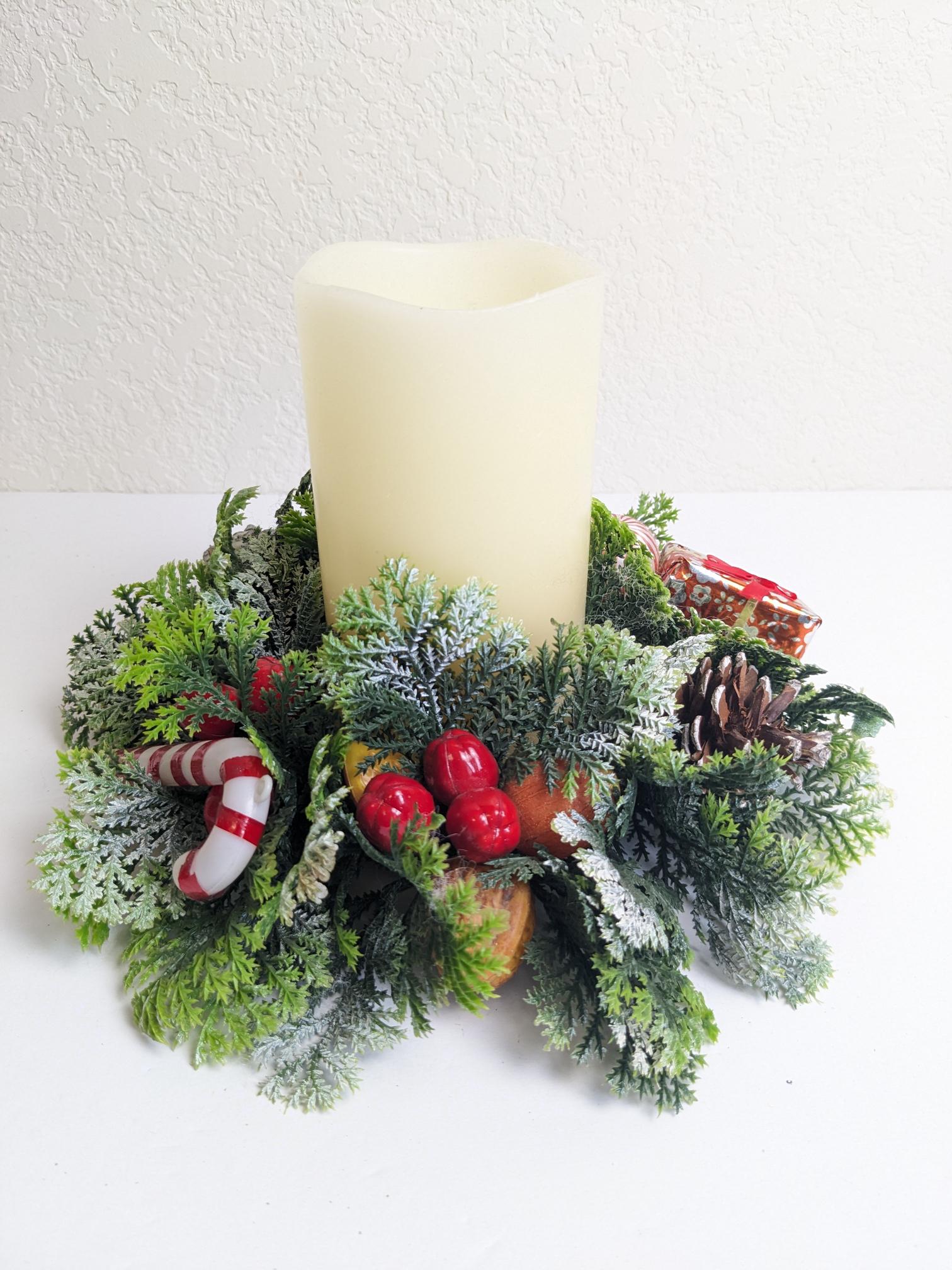 Vintage Christmas Candle Ring/Wreath from the 1960's. What a great find! Beautiful plastic green foliage with presents, pinecones, berries and a candy cane, very pretty. Perfect for any holiday table or mantel, would look fantastic anywhere.