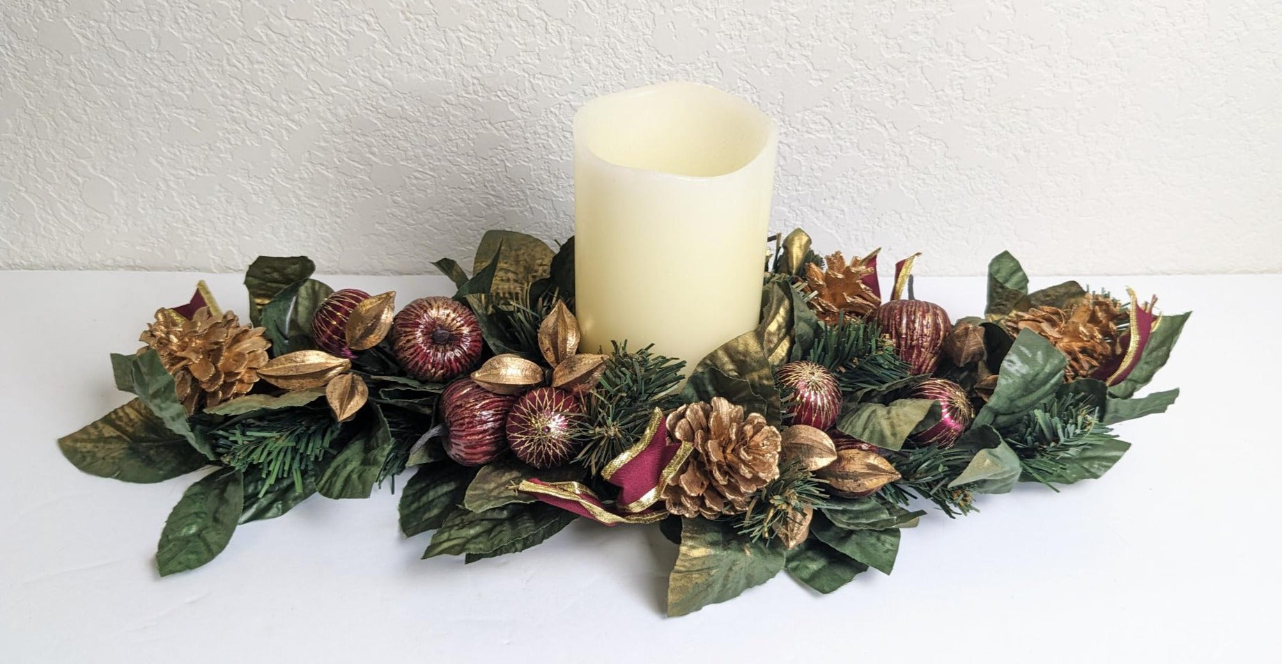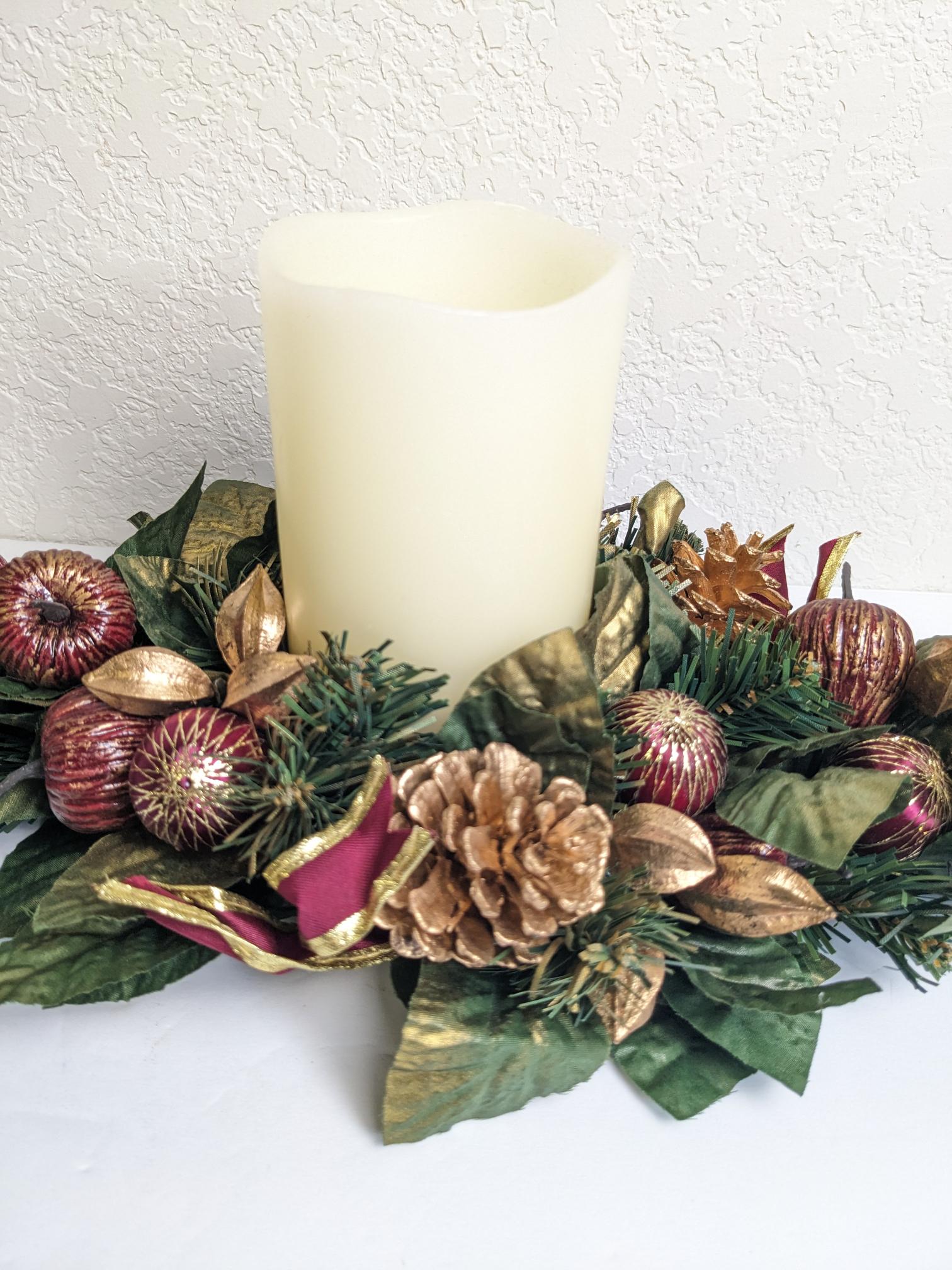 Vintage Christmas Centerpiece Candle Ring/Wreath. What a great find! Beautiful plastic green foliage with gold pinecones, fruit and ornaments, very pretty.