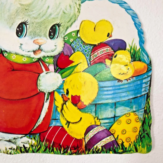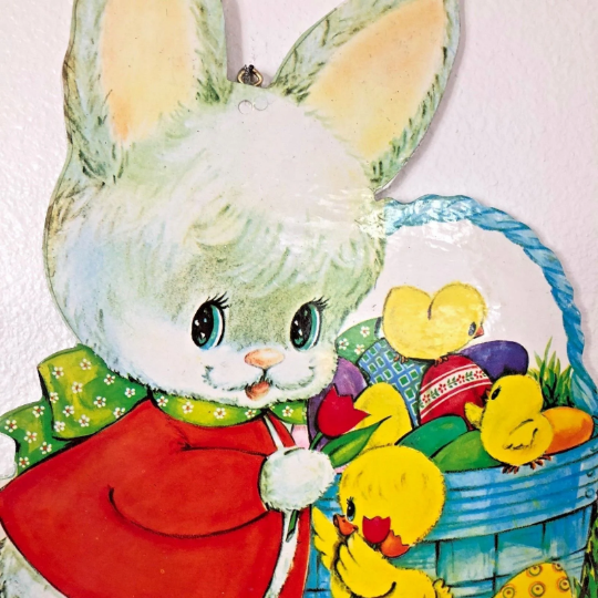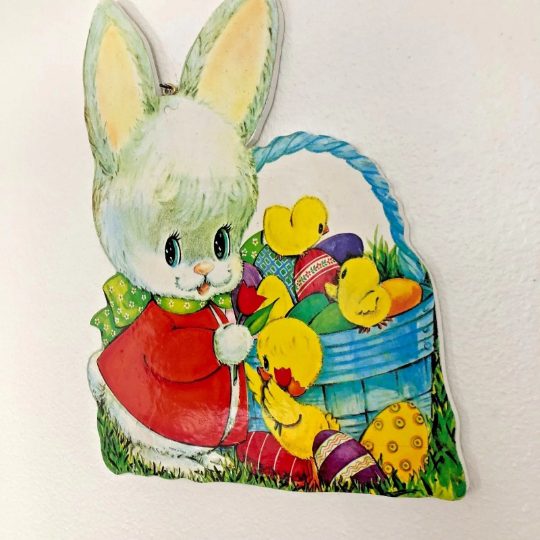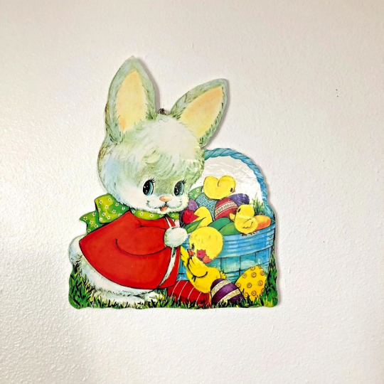 I attached this vintage Easter Bunny die cut to wood which was cut to exactly fit its shape and then sealed to protect the piece for years to come. A metal wall hanger was then attached for easy decorating!