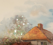 1907's Vintage Country House Card Framed in Distressed Turquoise Blue Frame with Mauve Matte. Measuring 9 1/2" x 7 1/2".