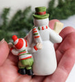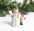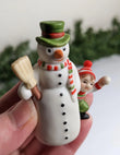 Vintage 1986 Lefton Colonial Village Christmas Figurine. What a great find. This gorgeous figurine features Brian and a Snowman. Brian is hiding behind a festive snowman while throwing snowballs, very cute.