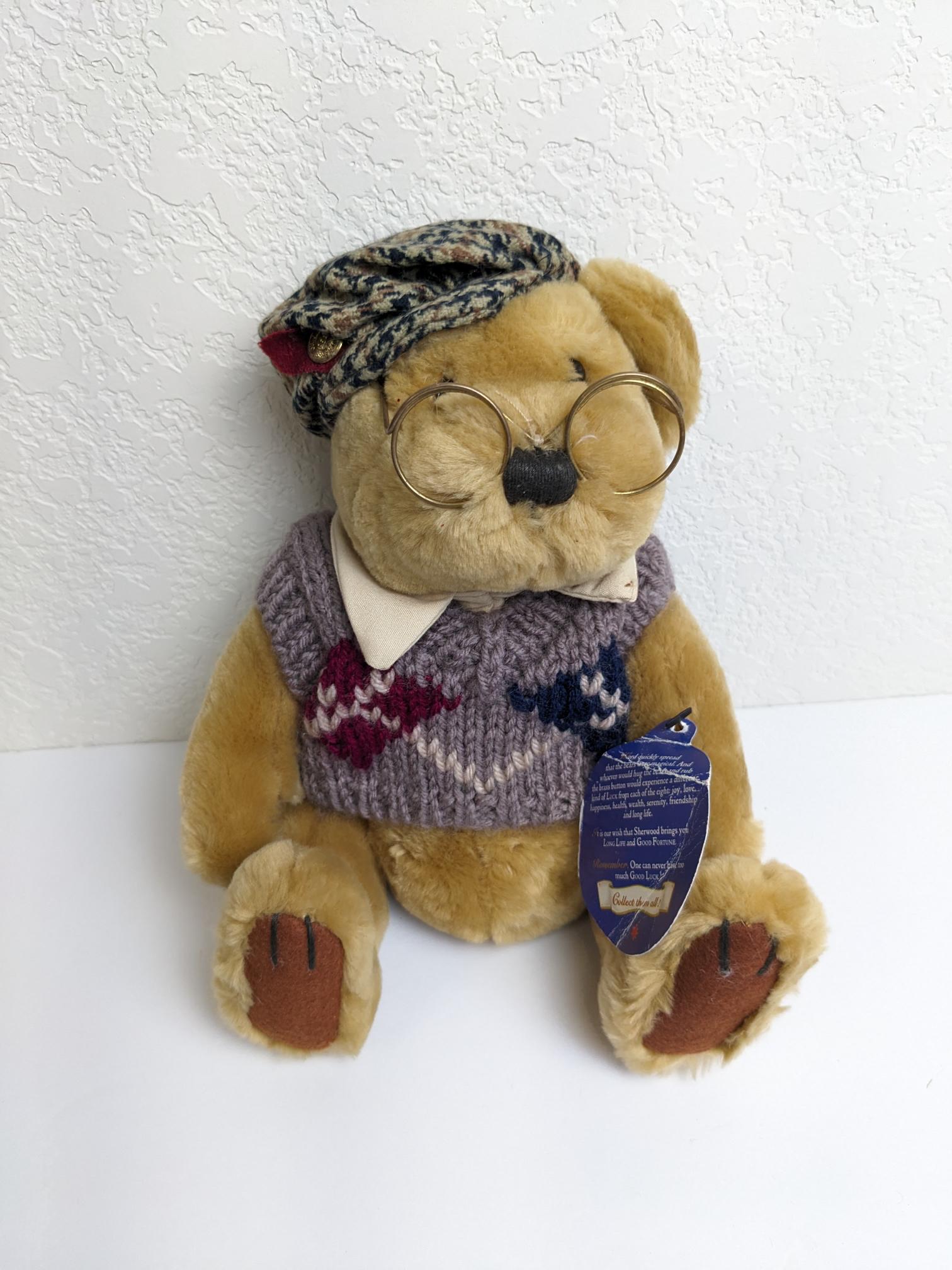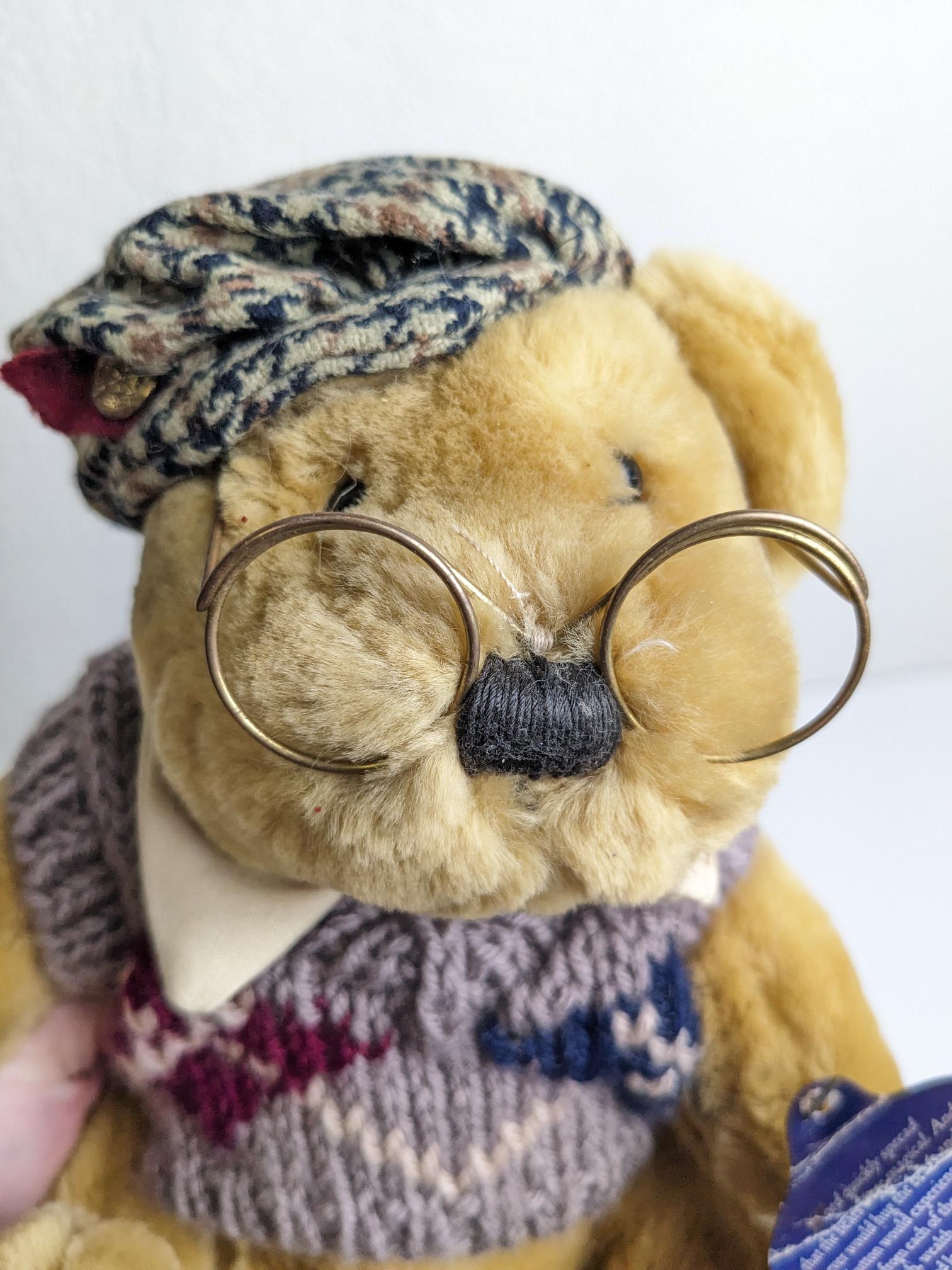 Vintage 1996 teddy bear, Brass Button Bear collection by Pickford Bears. 'Sherwood" bear is wearing a knitted sweater, hat with gold rim glasses, so cute.