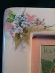 These cute little baby pictures make a great new baby gift, for baby showers and /or decorating your new baby nursery. They can be treasured for many years and the good news is, babies will not grow out of them (such as clothes). They are an adorable, treasured gift for all ages. This frame is a unique one. It is made of ceramic and has forget-me-not flowers hand painted on all of the corners of this frame. This frame was made in 1986, I know this because it was given to me as a college graduation gift. I had kept it all these years in the original box and now found a use for it. It is perfect for this baby picture. Some little baby girl is just waiting for this to go in her new room. Notice how precious she is tucked inside the pink rose.