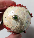 This is absolutely gorgeous! This ornament is ornately decorated with sequins, beads and pushpins. Fantastic vintage vibe with this stunning work of art. Bring retro back to you holiday season with this beautiful ornament.