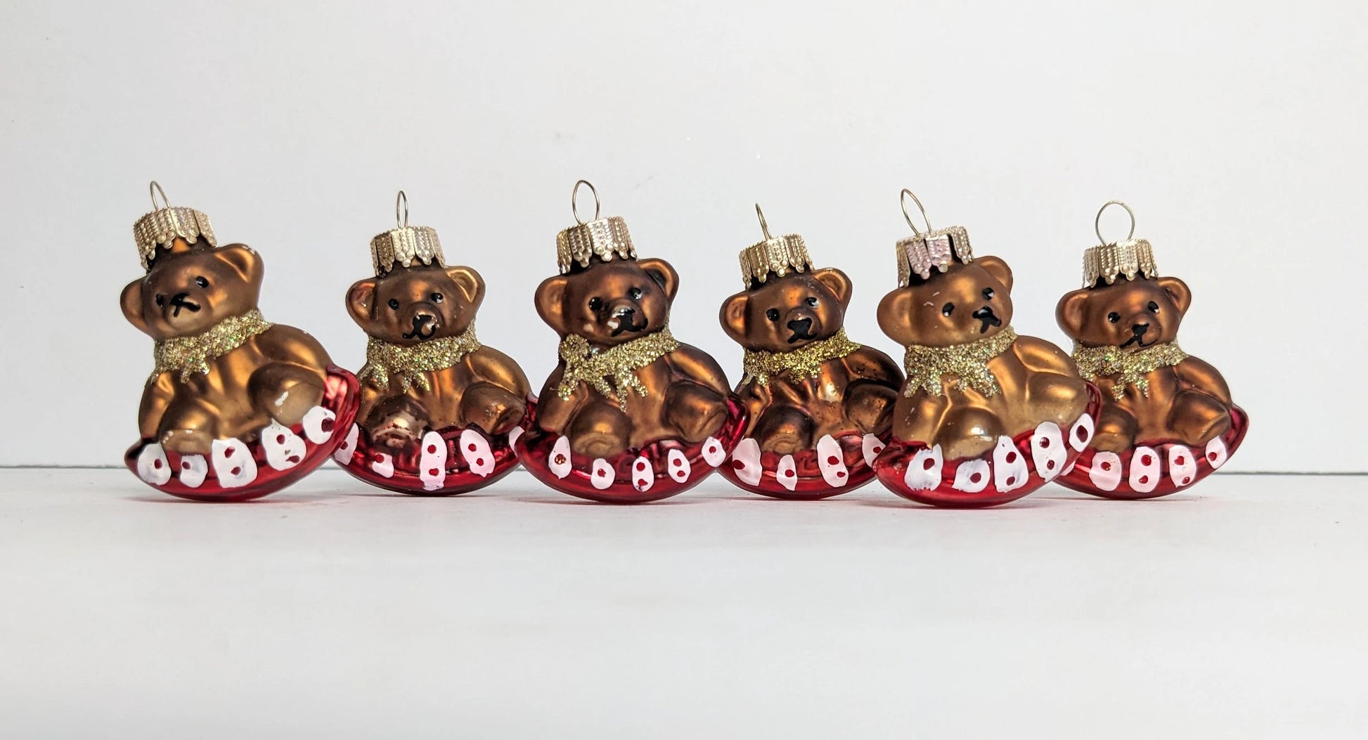 Vintage set of 6 Blown Glass Teddy Bear Christmas Ornaments.