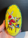 Vintage metal tin with Bugs Bunny as an elf painting Daffy Duck.
