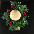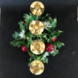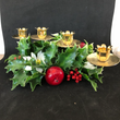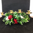 This is a really nice Midcentury Christmas decoration. It is a 4-spot candle brass candle holder with a nice sturdy base. Around the base is a mixture of plastic or wax holly, poinsettias, apples and red berries. It is basically a vintage candle ring around the base of this great candle holder. The brass is nice and shiny (although there are a few spots of discoloration on the candle holder). Everything is nice and sturdy. It measures 13 long by 6 high by 9 " wide. It would be a nice centerpiece for your Christmas table or actually anywhere in your house.
