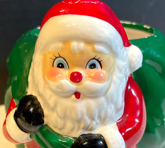 Good condition, it has some scratches on the paint on the planter and there is a scuff on Santa's mustache. Please see pictures. This just shows you how vintage this planter is.