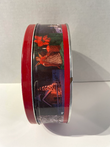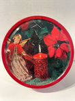 Tin was used for cookies. Super cute angel with a candle and poinsettia. Would make a great tin to give cookies or a cake in for Christmas. 7.5 by 3 inches.