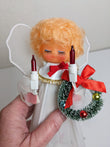 Wow, what a great find. Her head is made of plastic with blonde curly hair, so cute! She has a white tulle dress and wings and is holding a snow-covered bottlebrush wreath which can be removed if you desire.