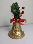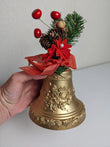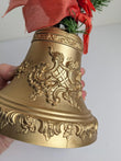 Beautiful gold bell with greenery, pinecones, berries and poinsettia flowers with bow accent at the top. This is gorgeous! Lovely detail on the bell. Wind it up and listen to it play Christmas songs, very nice. Perfect for your holiday season.
