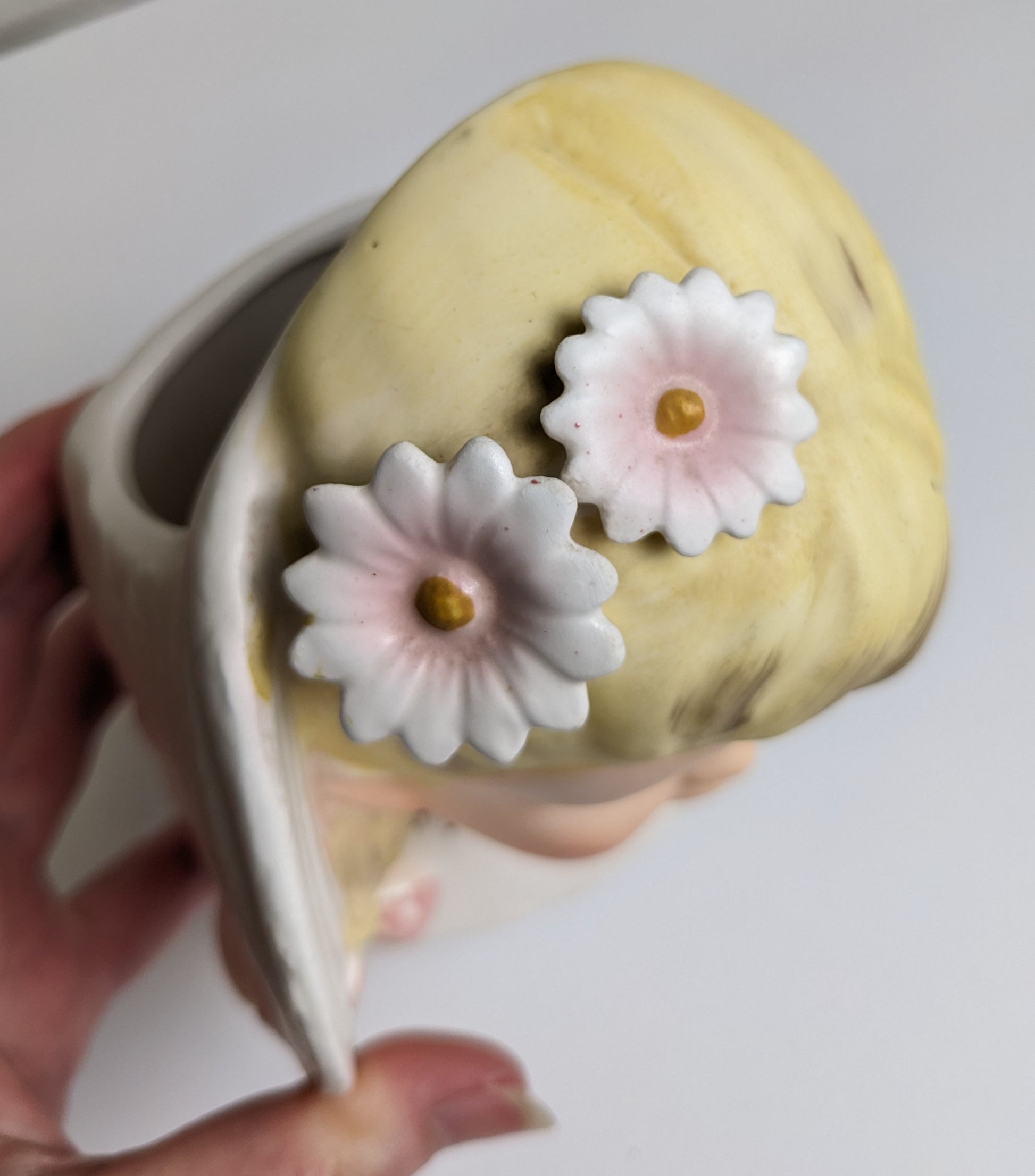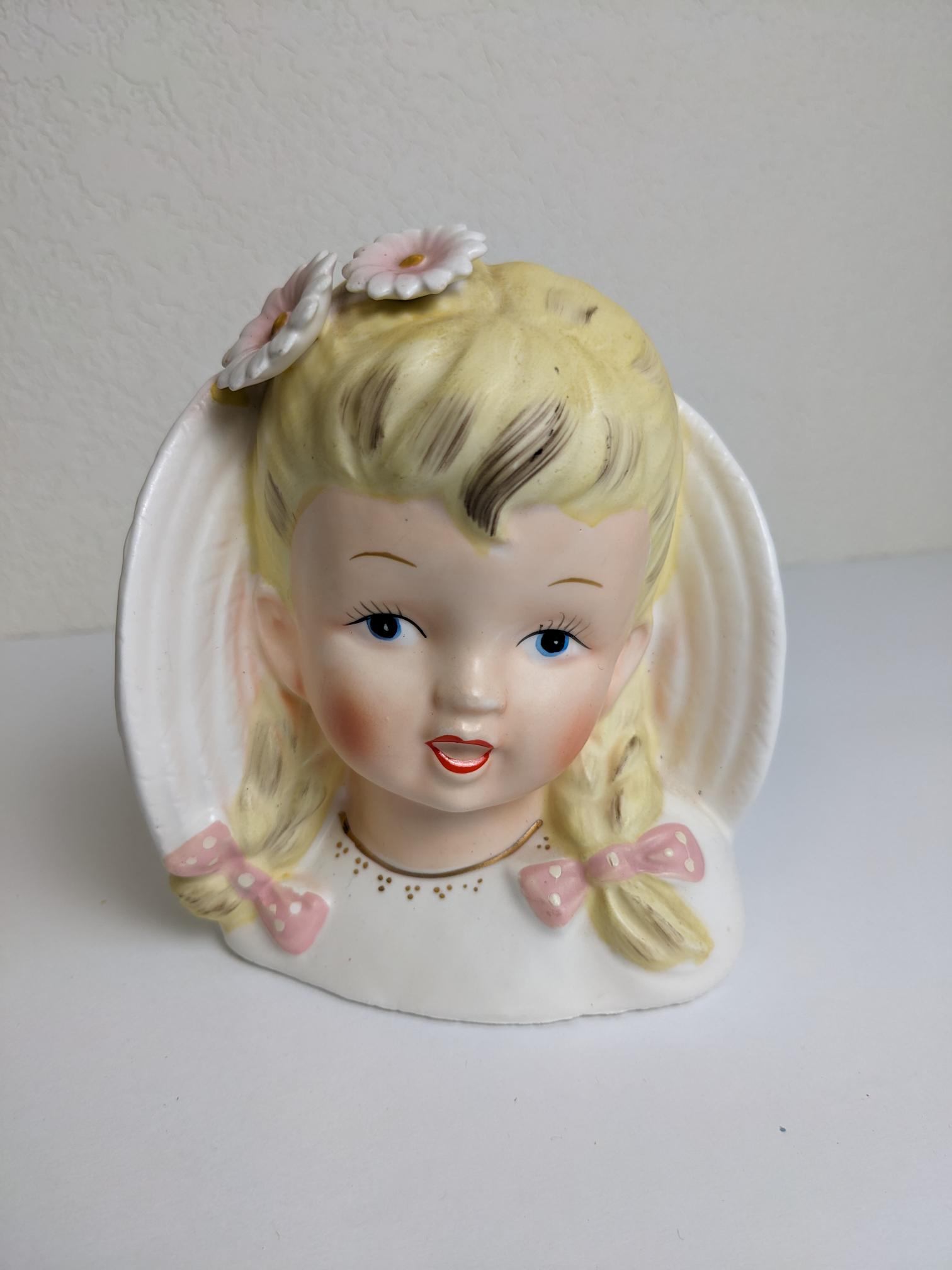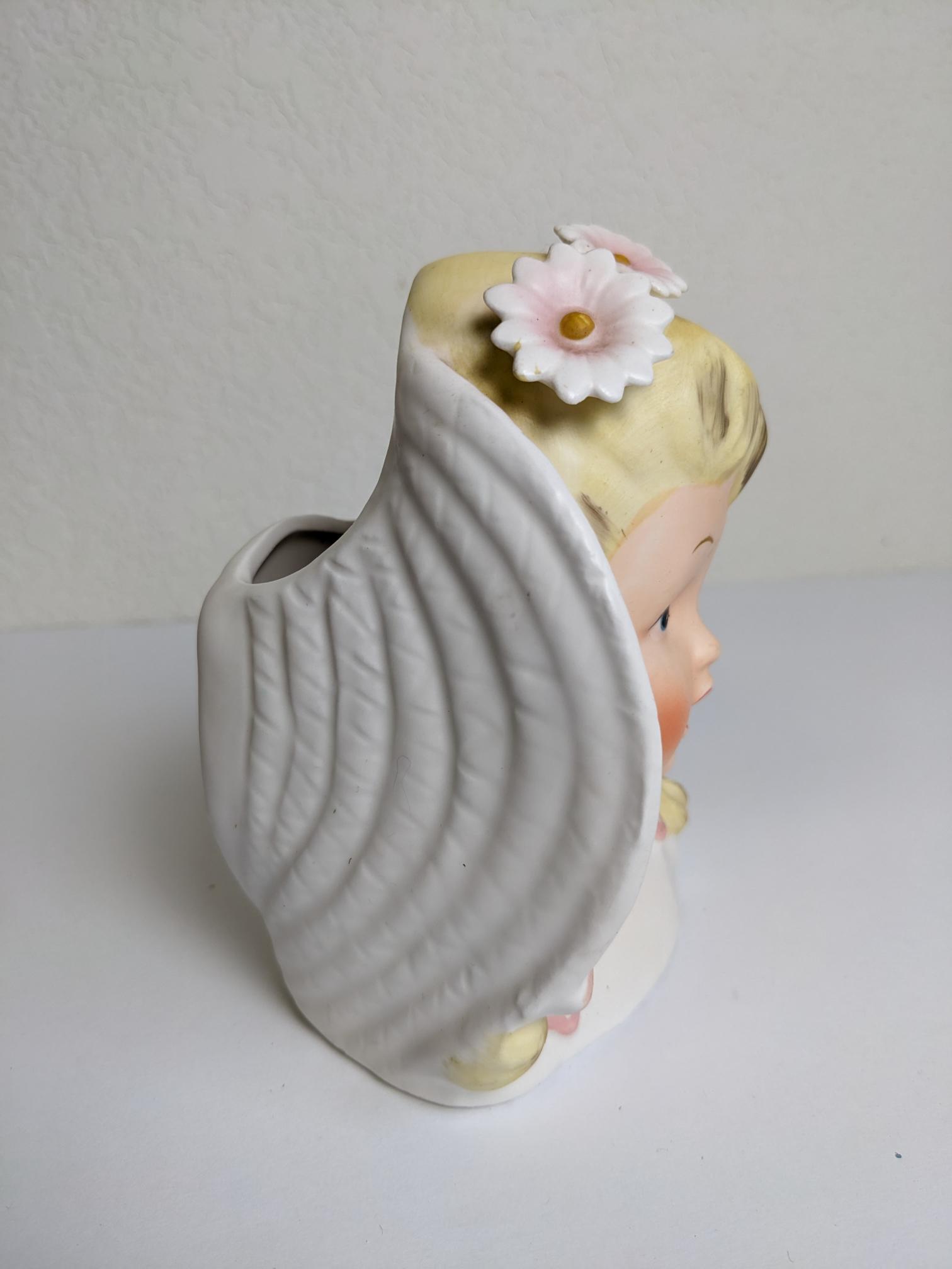 Beautiful, rare vintage Enesco Girl Planter Vase Made in Japan. This gorgeous planter features a blonde girl with pigtails with polka dot bows and 3d flowers in her hair, darling! Perfect for a gender reveal, baby's room or as a decoration for a baby shower, so many possibilities.