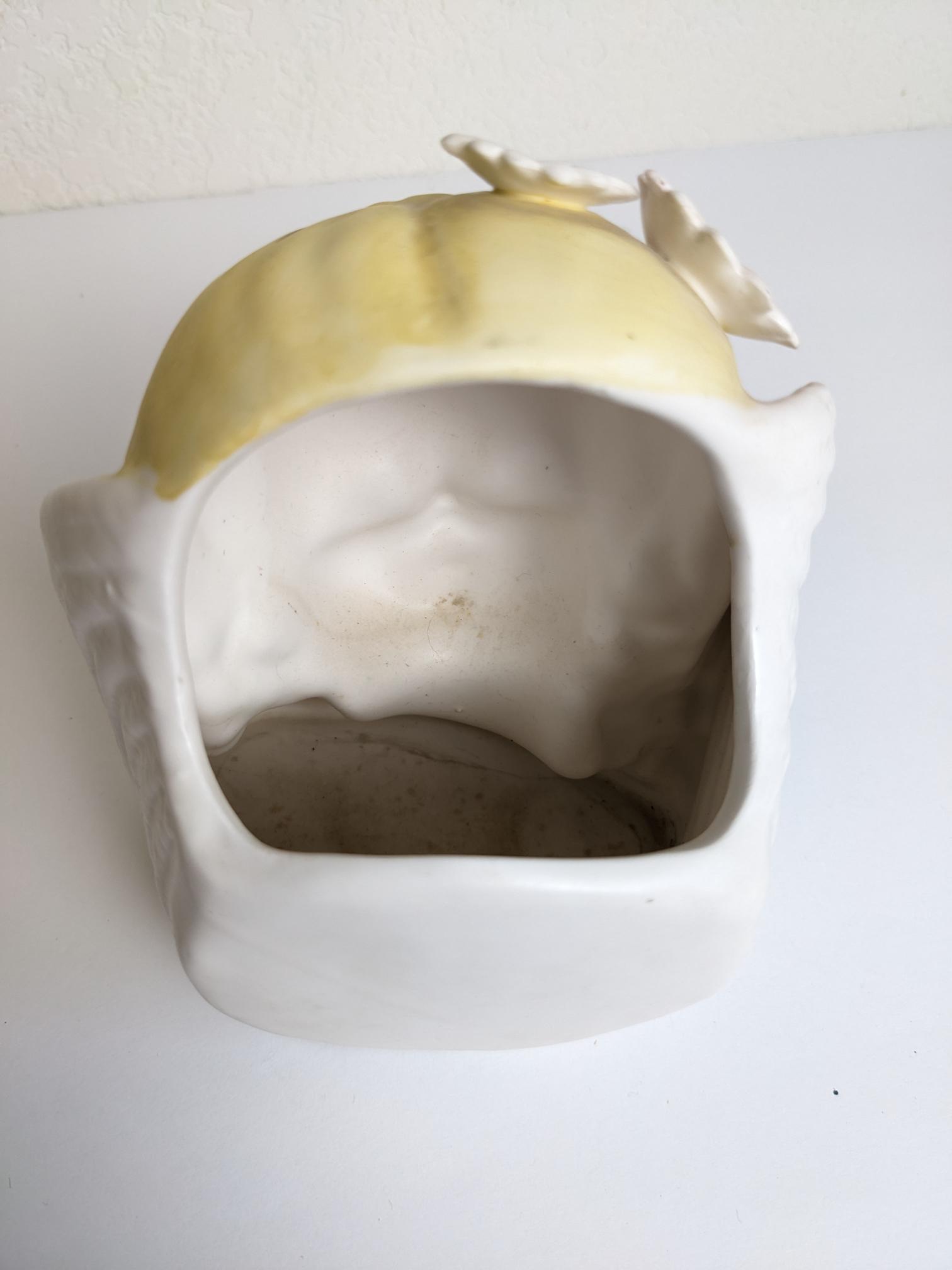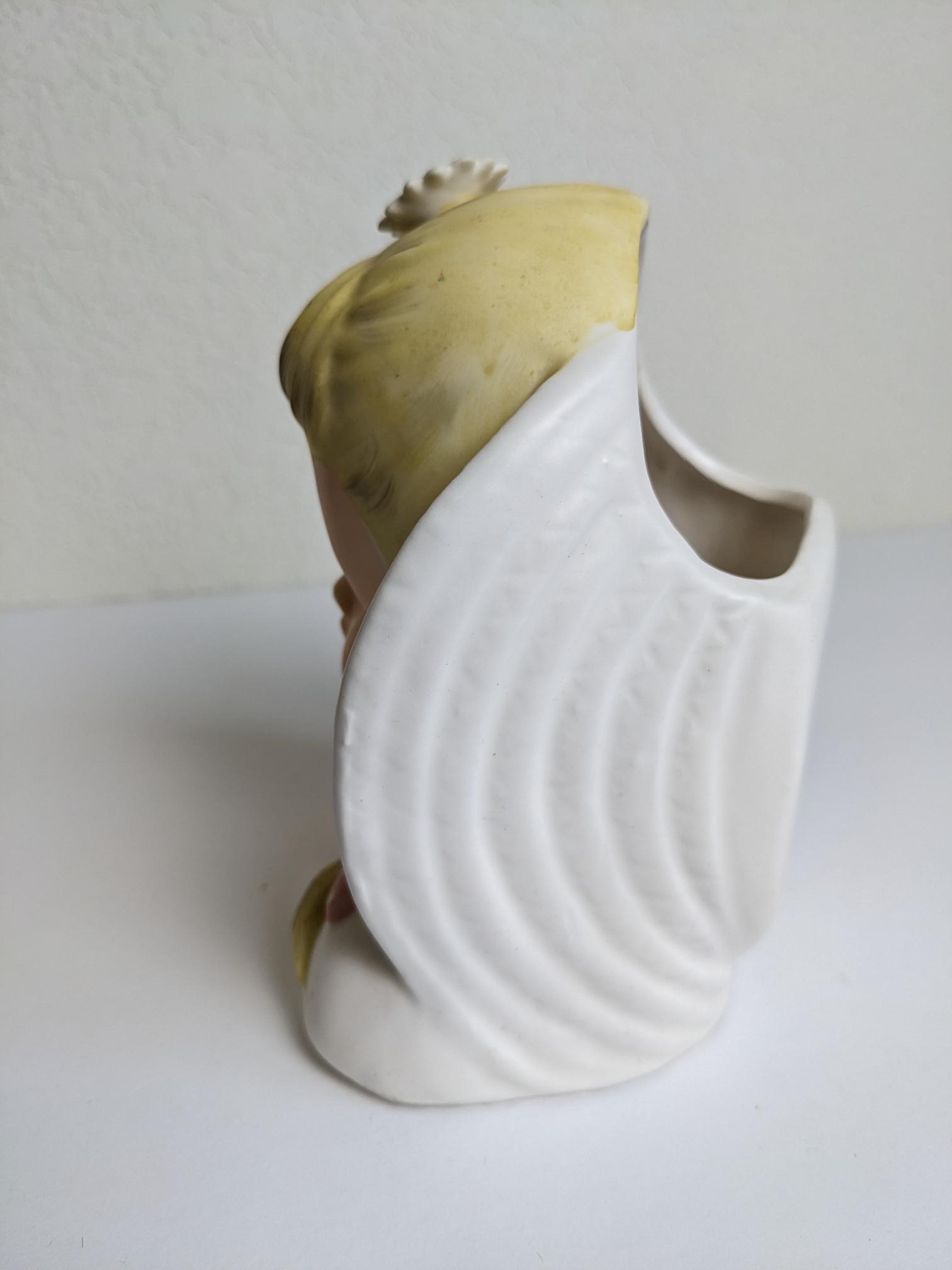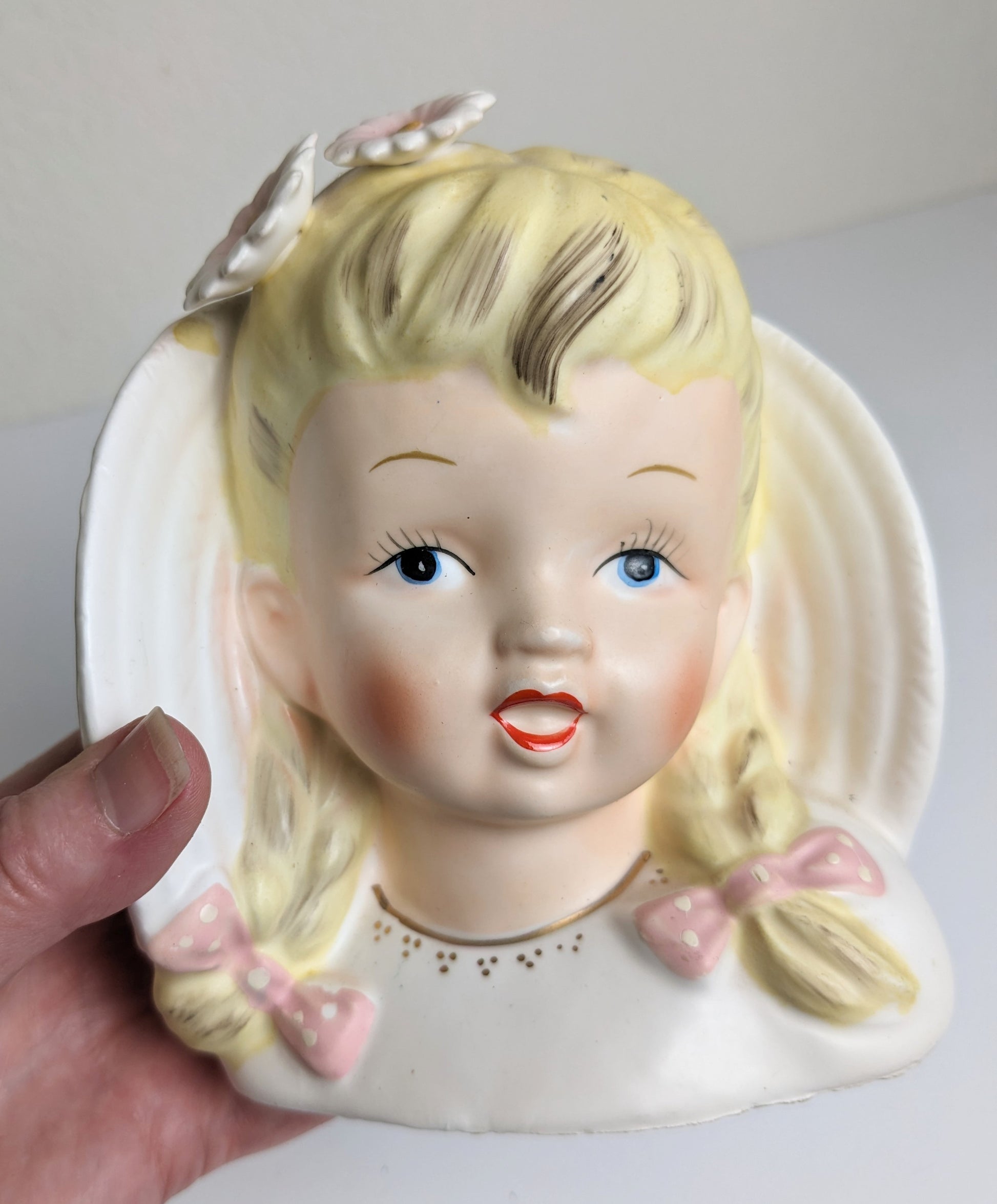 Beautiful, rare vintage Enesco Girl Planter Vase Made in Japan. This gorgeous planter features a blonde girl with pigtails with polka dot bows and 3d flowers in her hair, darling! Perfect for a gender reveal, baby's room or as a decoration for a baby shower, so many possibilities.