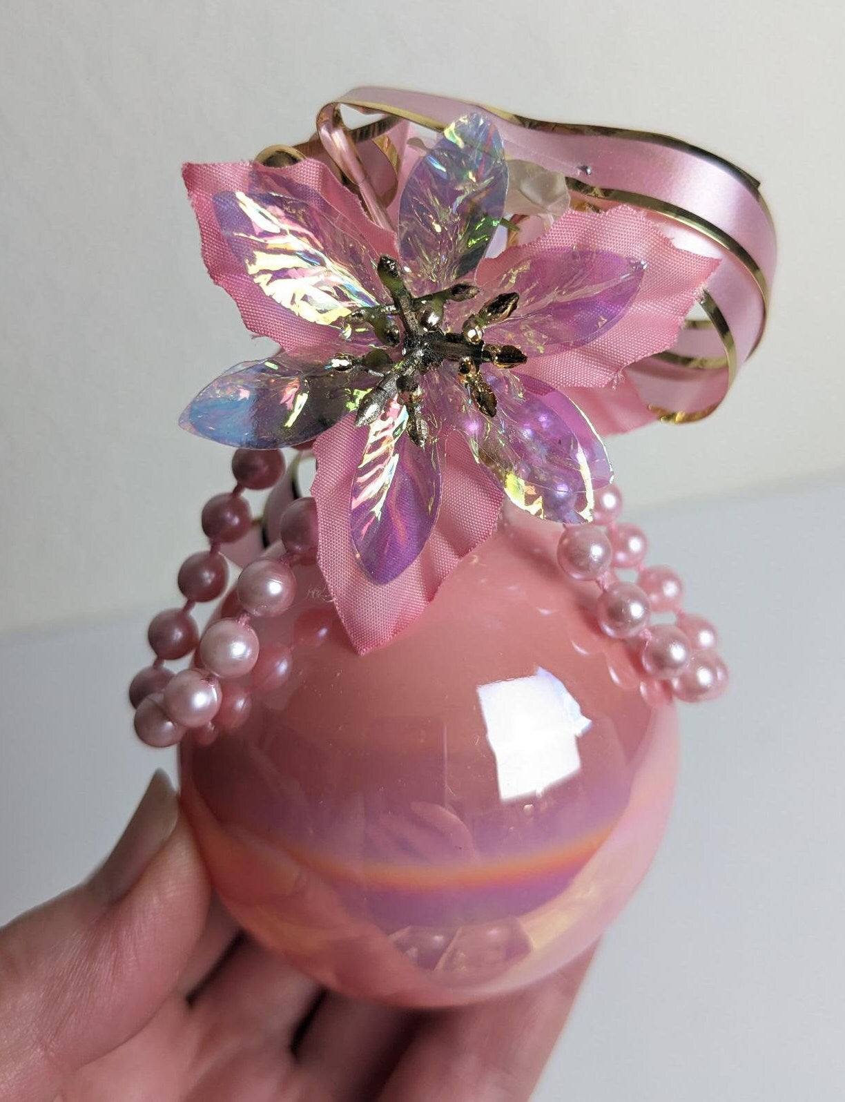 Beautiful Vintage Iridescent Glass Christmas Ornaments. These are absolutely gorgeous! You will receive 1 pink iridescent ornament,1 blue iridescent ornament and 1 white iridescent ornament all with beads, flowers and ribbon accents, very pretty.