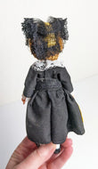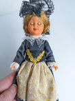 Vintage Goldschatz Appenzell Switzerland Doll. Darling plastic doll in a black dress with a gold apron and lace sleeve cuffs with a black veil, very pretty. Her arms and legs move up and down, her head is fixed. Eyes open and close beautifully.