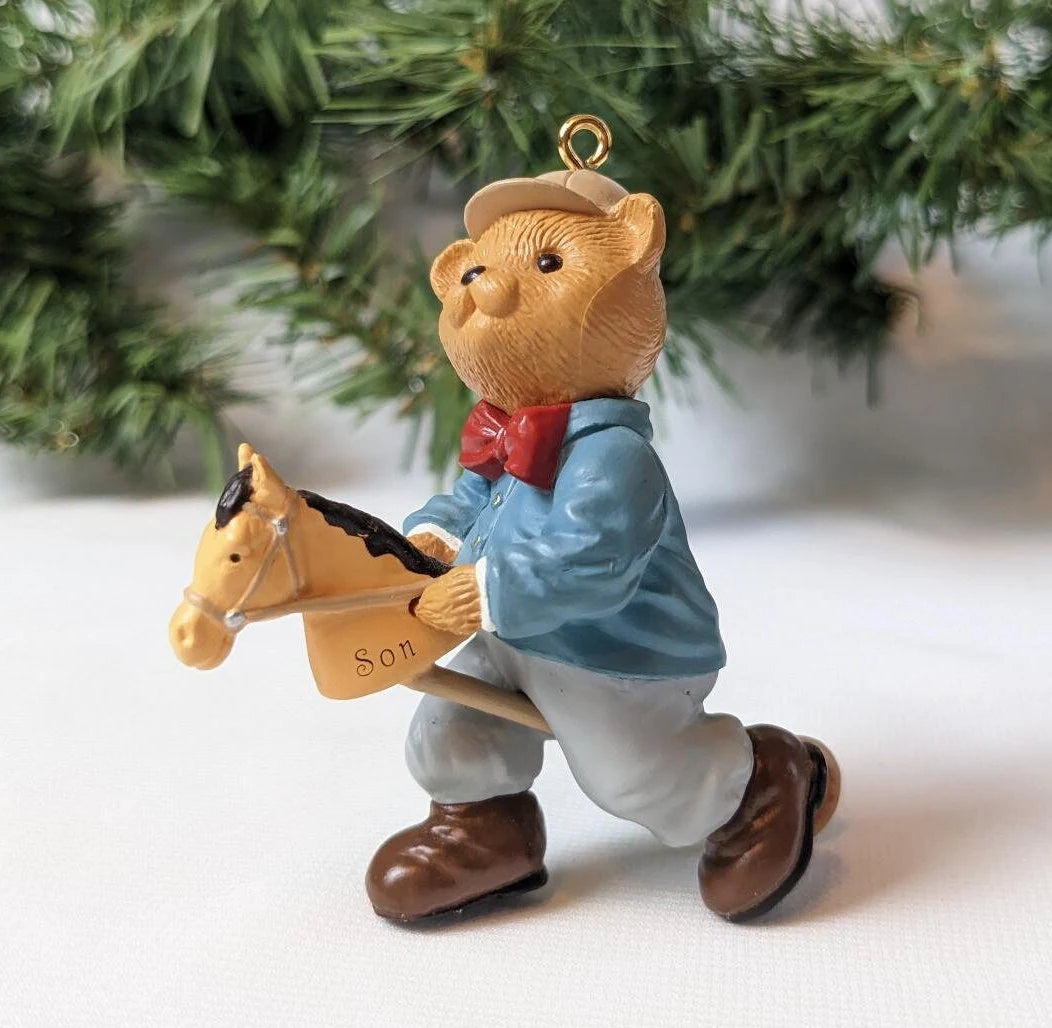 Vintage Hallmark 1996 Son Christmas Ornament. What a great find! This ornament features a bear riding a toy hobby horse, so cute. The hobby horse says Son one on side and is dated '96 on the other side. Perfect for the son or son like person in your life.