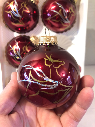 Vintage Krebs Deep Red colored Christmas Ornaments with Gold and silver glitter reindeer stenciled on them.