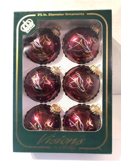Earthy-warm colors with gold and silver metallic design work with this neutral shade of deep red. The ornaments are 3" and are in great condition.