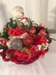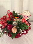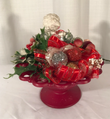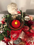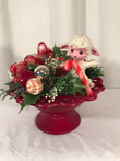 Welcome the Christmas season with flickering candlelight set on this vintage Christmas -inspired red glass pedestal container . The added flameless candle in warm colors adds to the coordinated look. The greenery, balls and lamb add the special extra touch to this one of a kind centerpiece. This is a super cute must have piece to add to your vintage holiday decor.