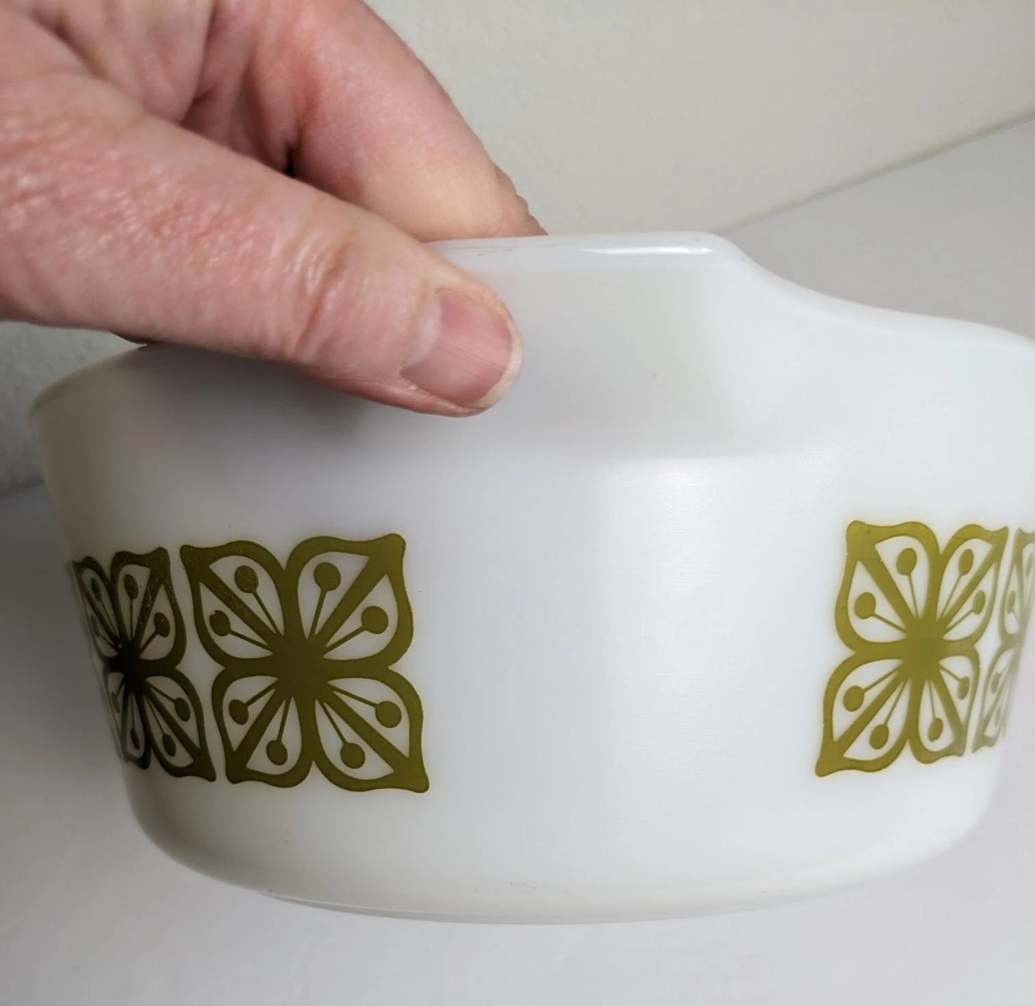 Vintage Pyrex Verde Green Flower Casserole Nesting Bowl. This vintage Pyrex baker is just gorgeous! It holds 2 1/2 quarts. The graphics look fantastic, and the inside is nice and shiny with some marks, please see all pictures.