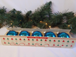 These retro set of 5 shiny blue glass ball ornaments are absolutely beautiful. They are in vintage condition with light scratches and missing paint that really gives them a wonderful retro feel.