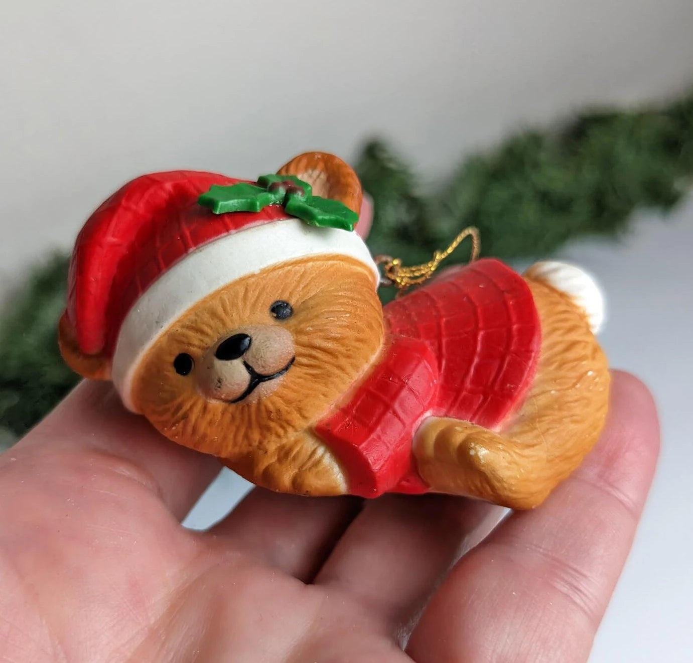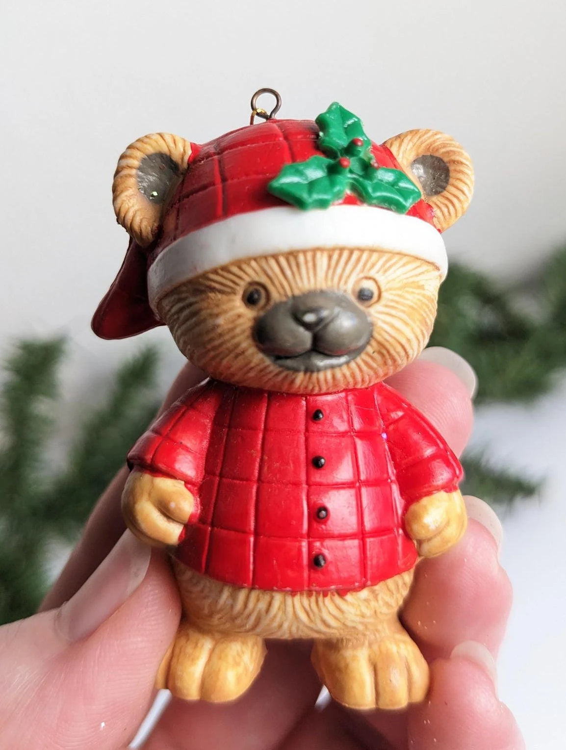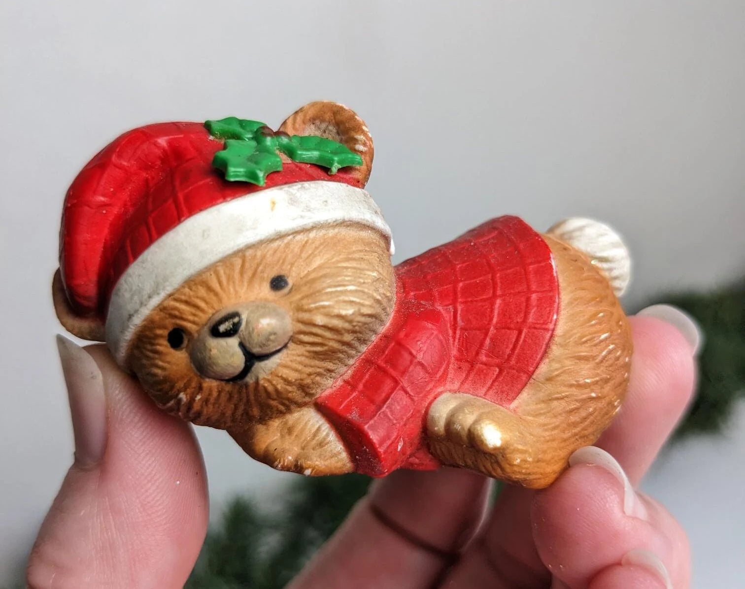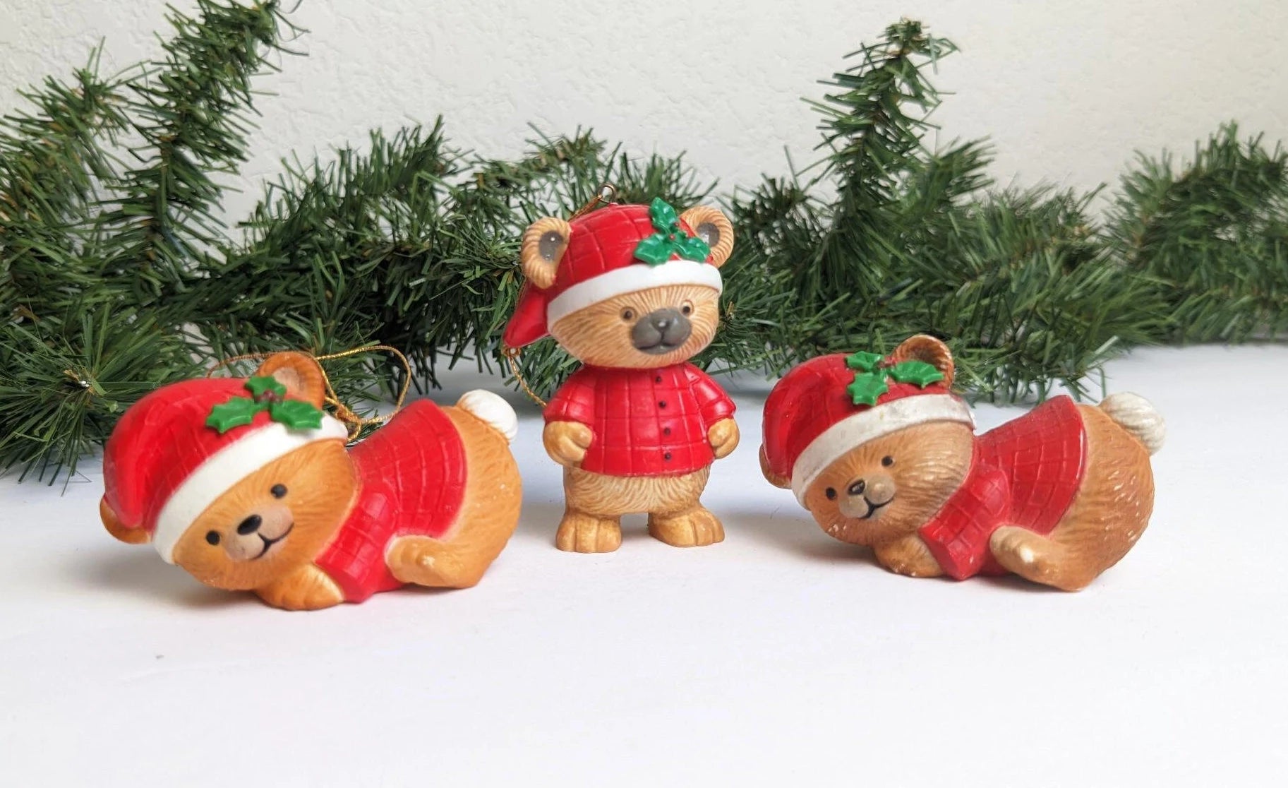 Vintage Enesco Set of 3 Santa Bear Christmas Ornaments, made in Hong Kong. This is a rare find! These ornaments feature a bear wearing a Santas hat with a holly accent in different poses, so cute. Perfect for the little one or vintage lover in your life.