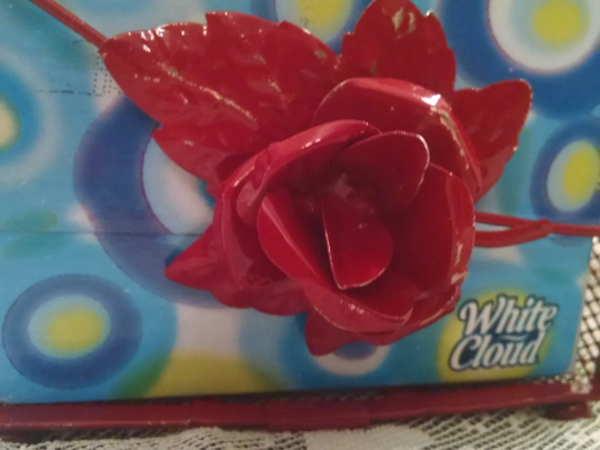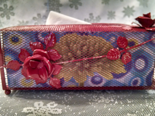 The tissue box slides in the side door what swivels open and then latches when the box is inside. The flowers have detail on them , so I lightly distressed them once I was done painting. I think it adds to the overall vintage look nicely.it fits around a normal sized box of tissue or Kleenex. It really dresses up a normally boring tissue box.