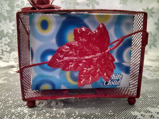 This is a lovely vintage red tissue box cover or tissue box holder. I put this under bathroom accessories, but it really can be used in any room of your house. I have one in turquoise that is in my bedroom on my nightstand. They really are multi room accessories. It is a gold metal mesh base with little "ball " feet.