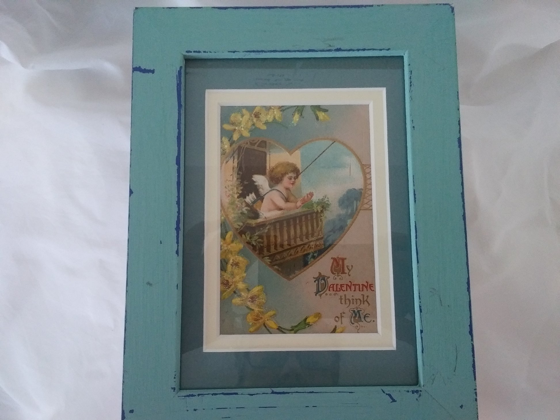 I take great pride in making each one of these special pictures myself by gathering vintage postcards greeting cards from the early to mid 1900's then pairing them with an upcycled 5x7 frame. The frames are painted lightly distressed, then the cards are bedazzled then surrounded with color coordinated mattes assembled by hand. In doing this, I am creating a new product out of old recycled items. These adorable little pictures all have their very own tale to tell. Most of the postcards that I work with come from the first decade of the 1900's were hand written with pens dipped in an ink bottle and then delivered via the Pony Express!!!