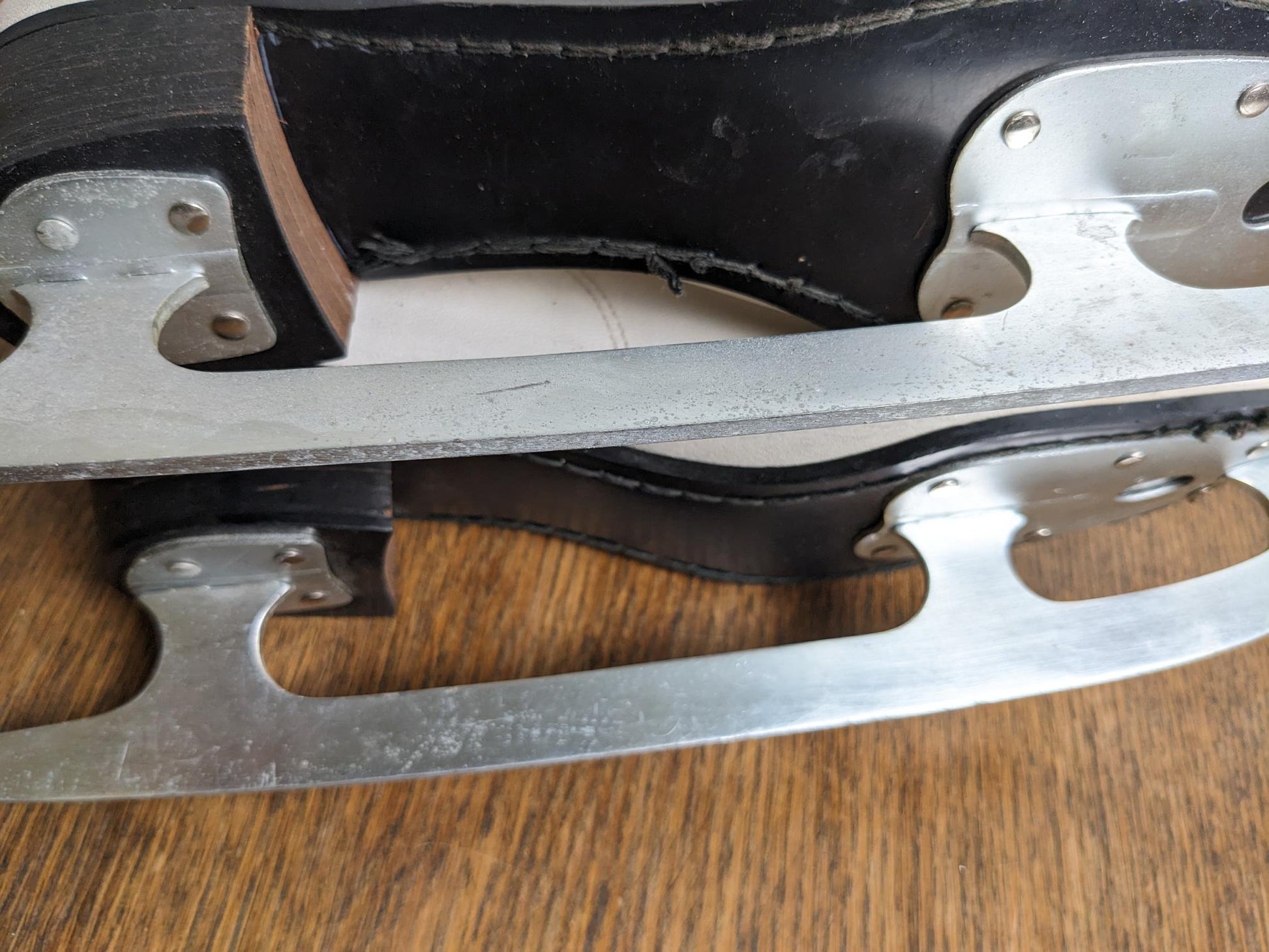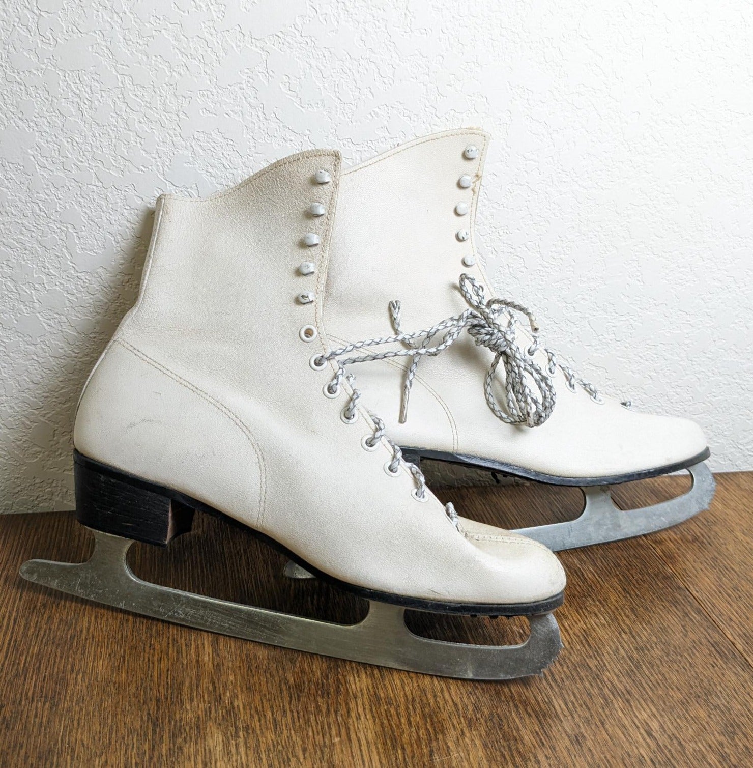 Vintage white leather ice skates size 9. Wow, these are fantastic! What a great find. They are in great vintage condition with some wear to the leather and light rust to the rails which only adds to their great retro vibe. Hang them in your mountain cabin or can be used on the ice. They are in great condition for their age. Please see all photos.