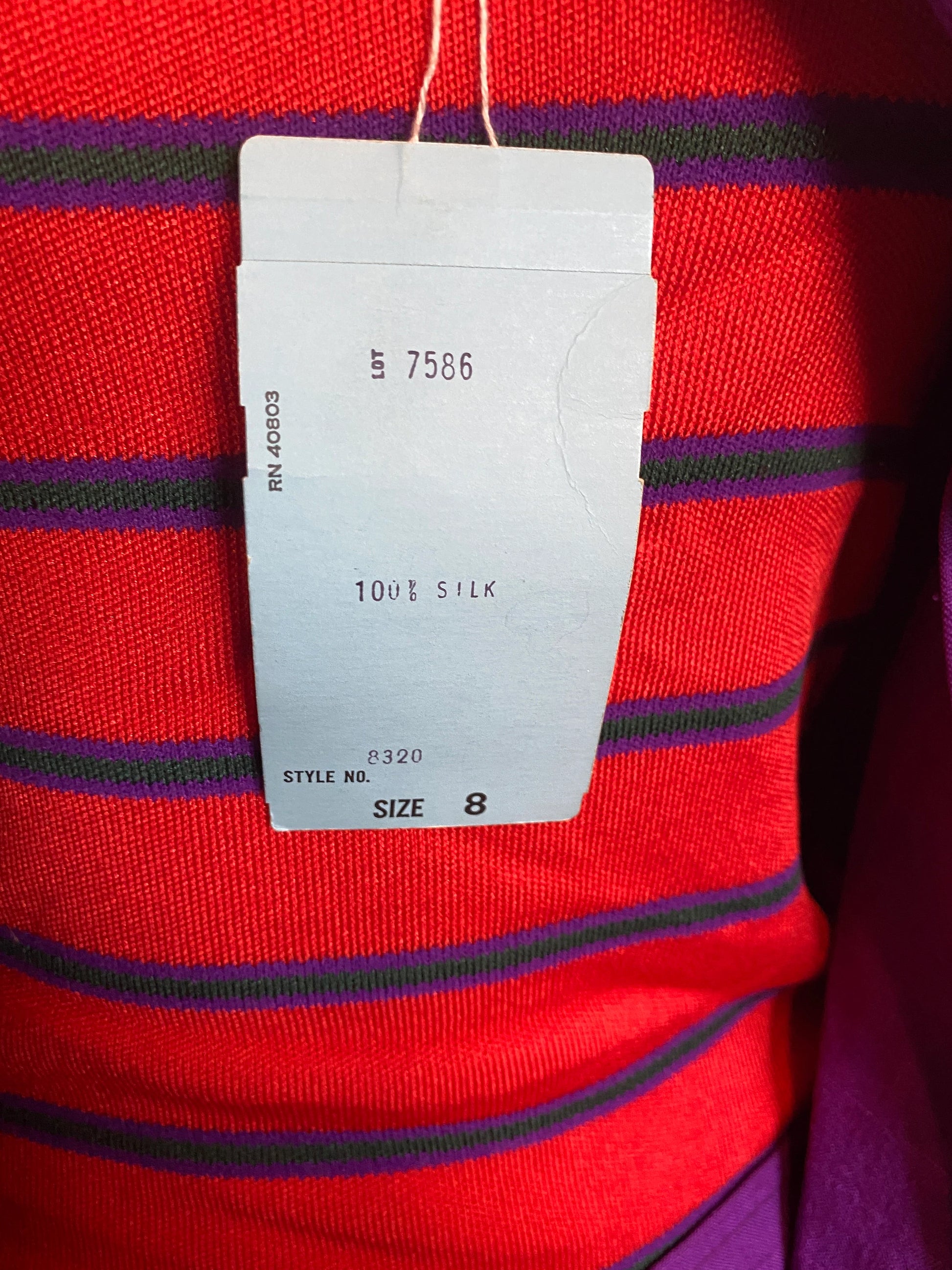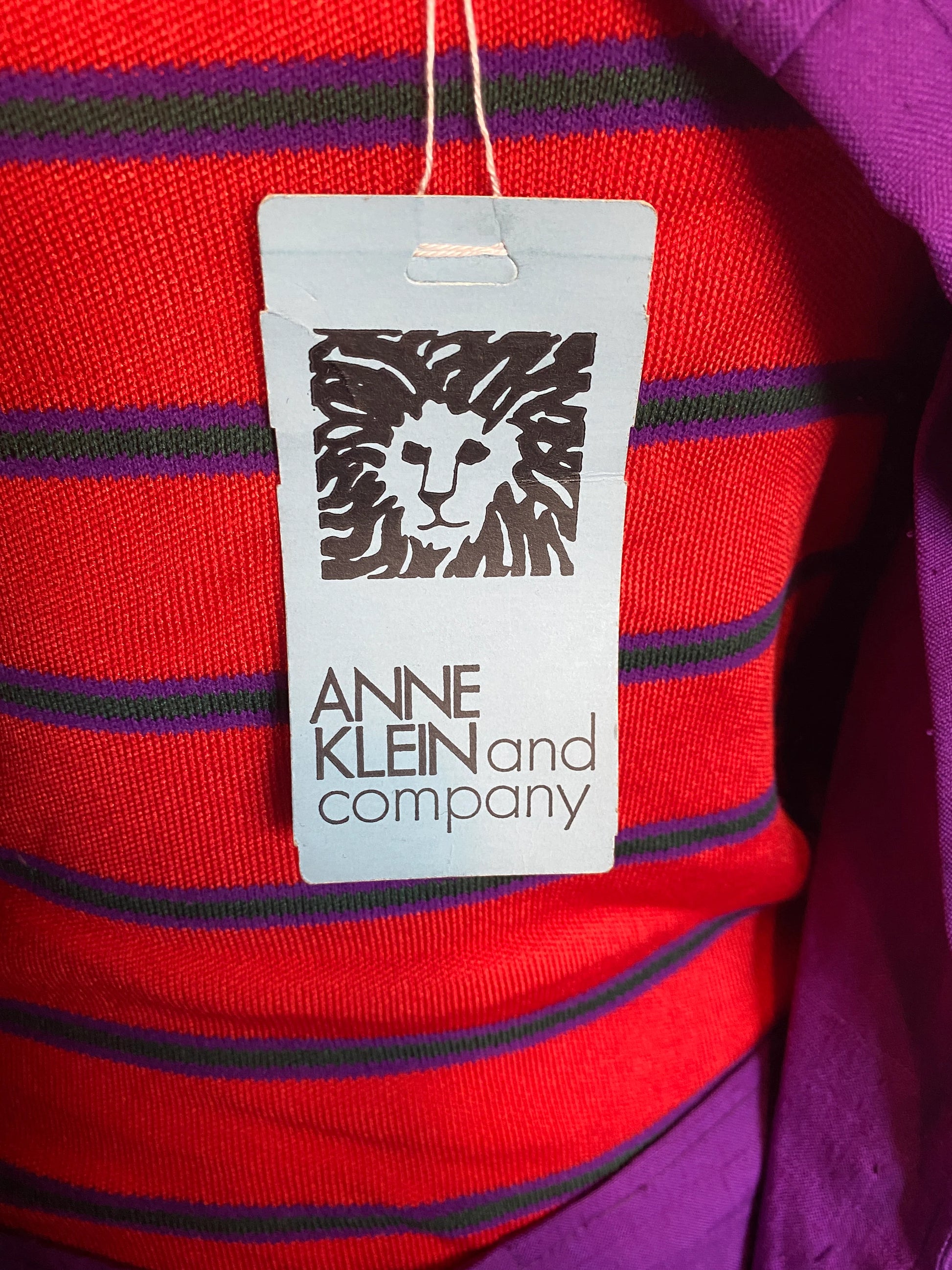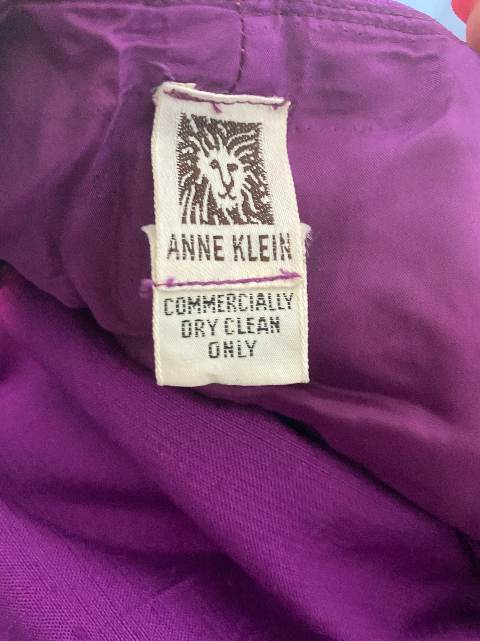 Description: This vintage 3 piece suit is exactly what you need to add to your vintage closet. A royal purple pant suit with an additional red, purple and green striped body suit to complete the three piece set. The vibrant colors and professional look to this incredible Anne Klein set is everything you could want and more. The 3 piece suit offers pockets, full length sleeves, and a light breathable material making it perfect for any occasion. And the pants are bell bottoms, how cute?! This set is dry clean only.