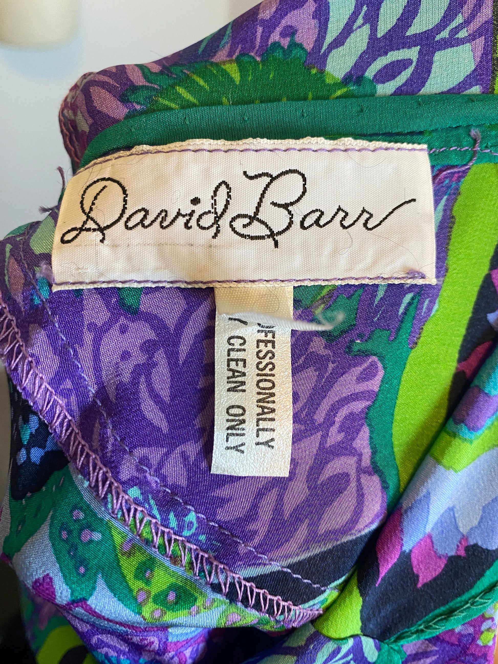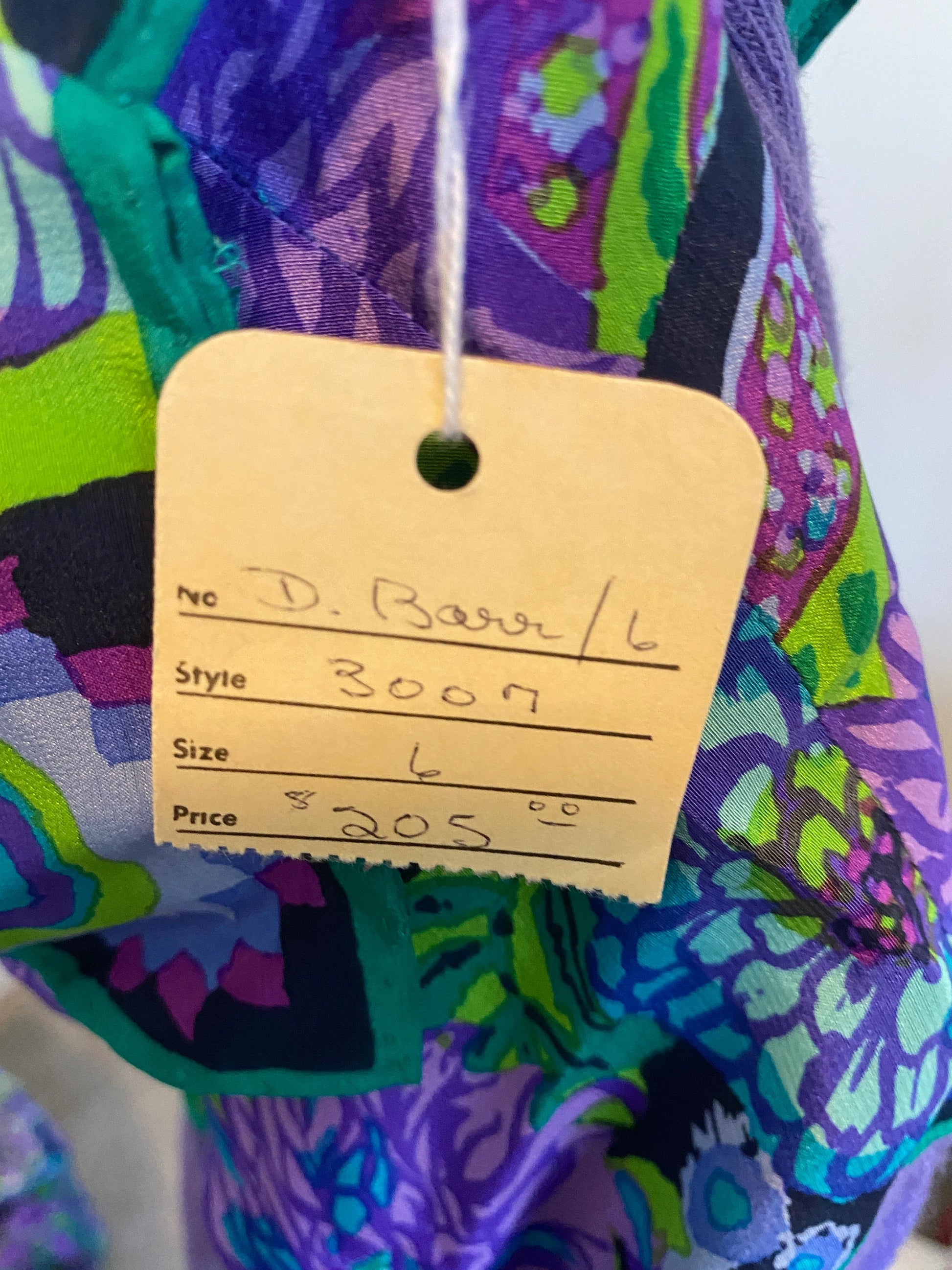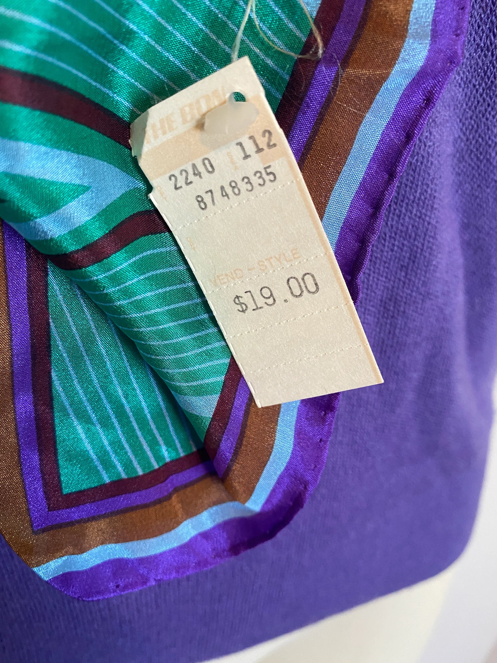 Description: This vintage sweater and skirt is vibrant and perfect for any occasion and it has an added Anne Klein patterned scarf which absolutely completes the outfit. The purple, green, blue and black colors all together will certainly make a statement piece in your closet. This set has the original tags still on it which I think speaks to the quality this set is in. it has never been worn. Get it today! This set is dry clean only.